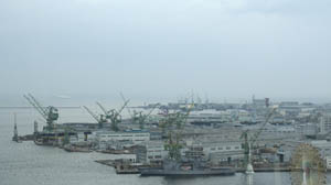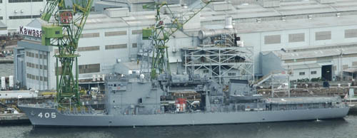 川崎重工のドックが近くにあります。ポートタワーからも、入渠中の船や接岸中の船が見えます。この日見れたこの船は、自衛隊第2潜水艦隊群所属の潜水艦救難母艦「ちよだ」です。たぶん。