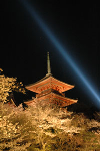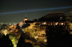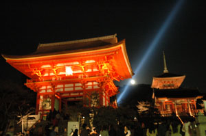 桜の時期と紅葉の時期には、夜の特別拝観をやっています。清水寺のライトアップは、桜(や、秋には紅葉など)とともにものすごく幻想的で綺麗ですよ。もちろん、人の数もものすごいです。人、人、人、人・・・人ばっかり。