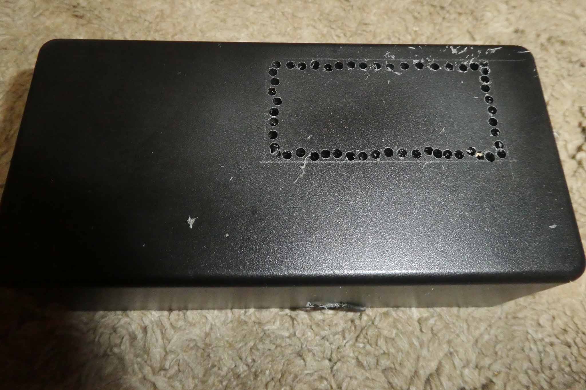 プラケース(TW7-5-13SB)を使用し、鉛筆でプラスチックケースにバッテリーモニタの大きさに合わせた四角枠を書いて、若干小さめの位置にΦ2程度のドリルで複数穴を開けました。