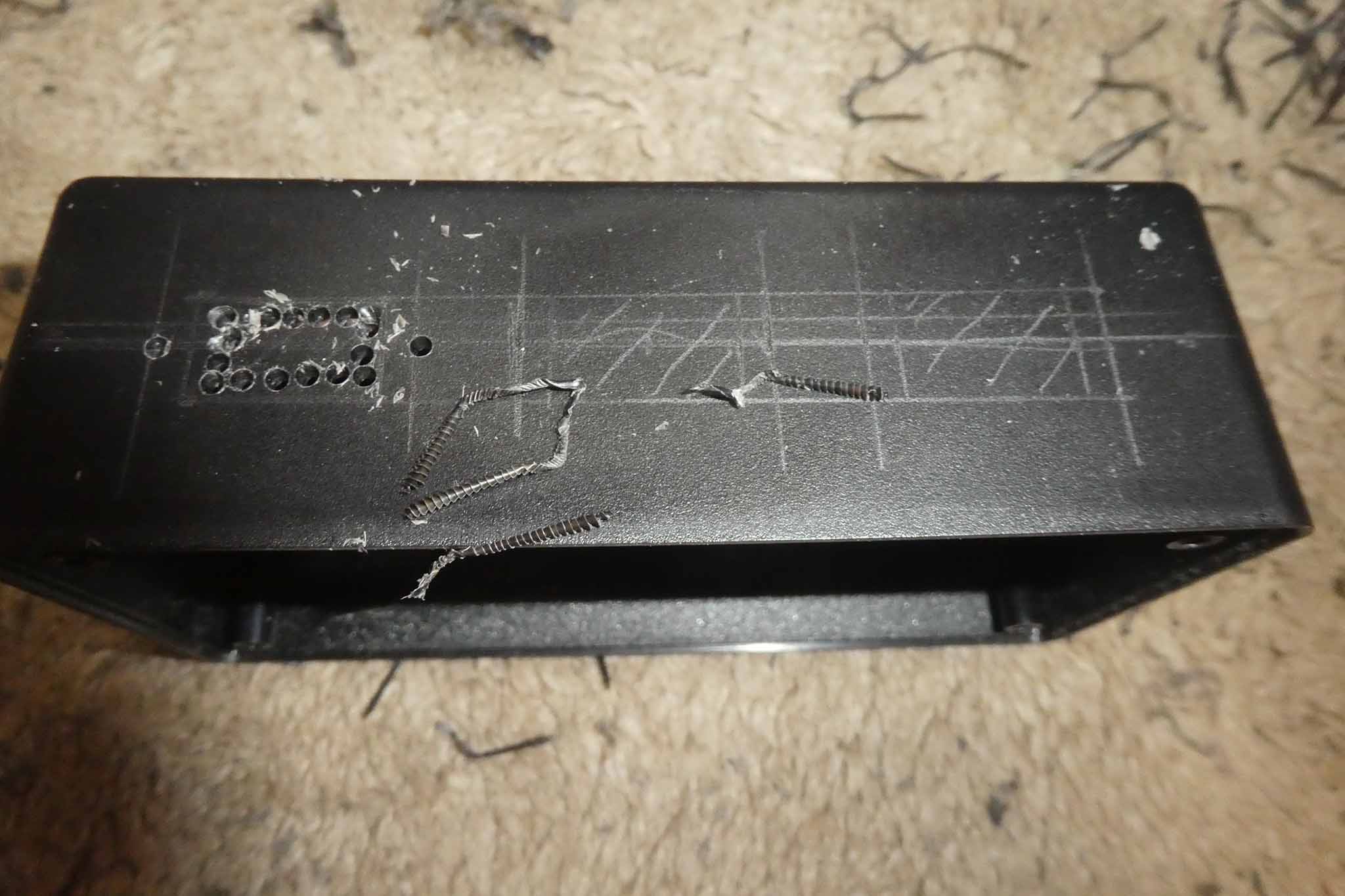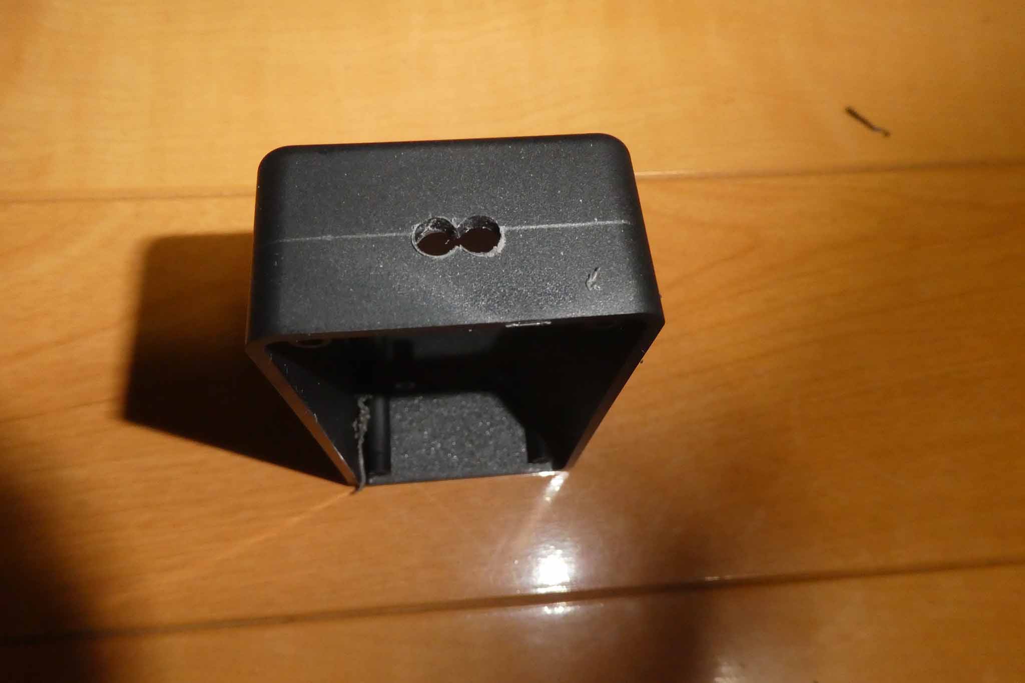 DCプラグ穴は単にドリル穴をあければいいだけですが、延長ケーブルを通す穴は、このように2つの穴をドリルであけて、間の壁をニッパーで切り取ることで、2つの穴が眼鏡状につながった状態にしました。