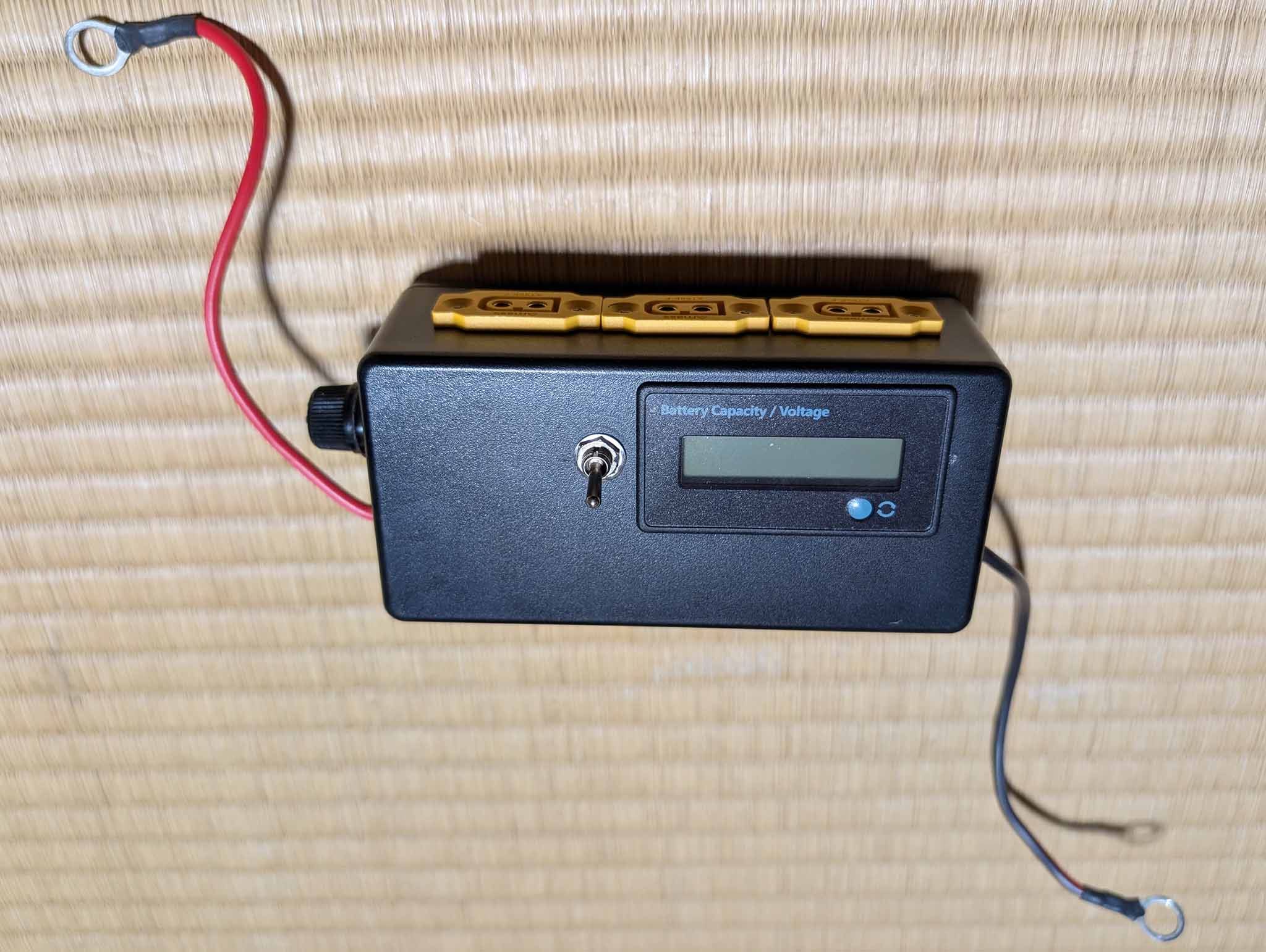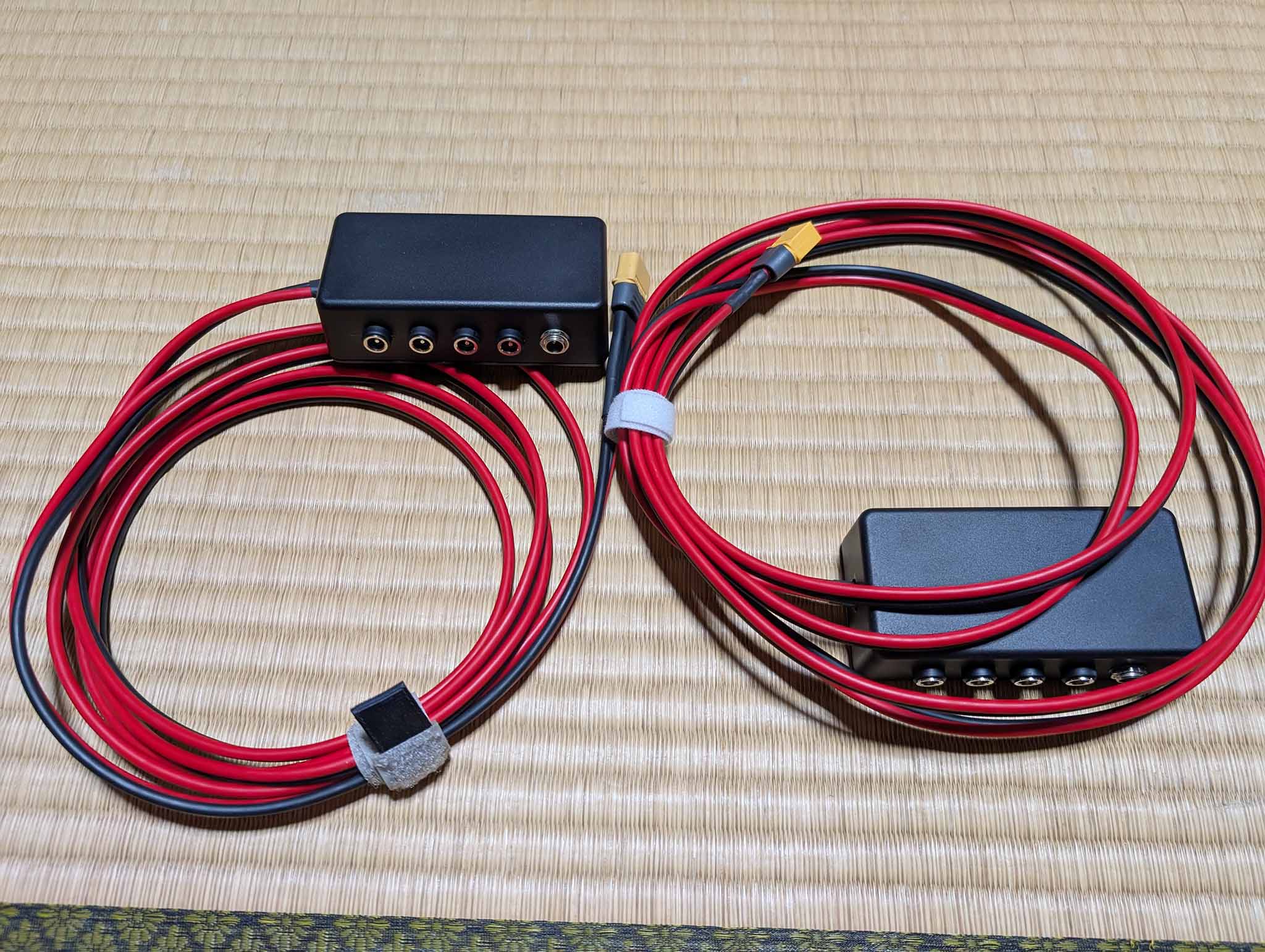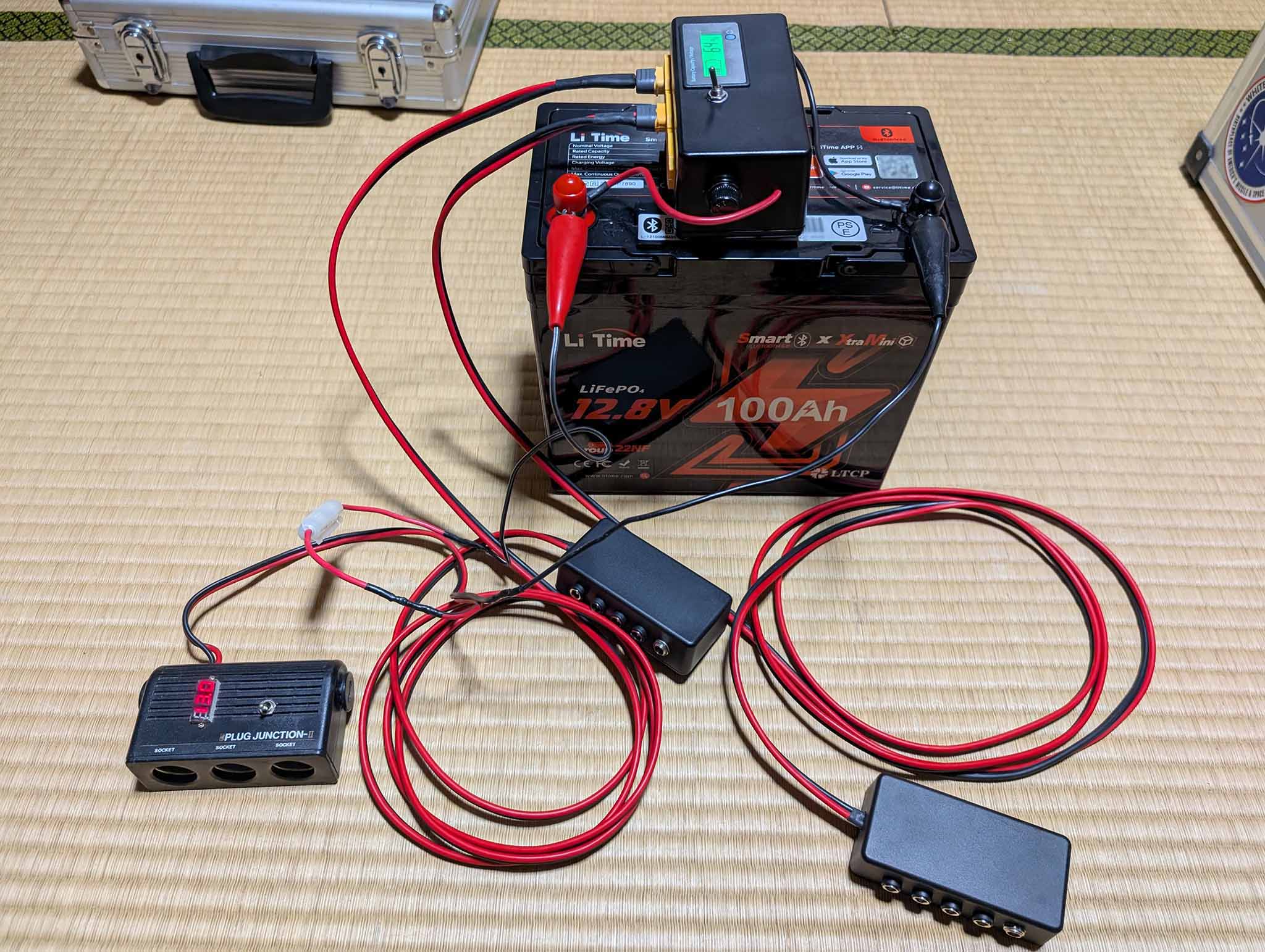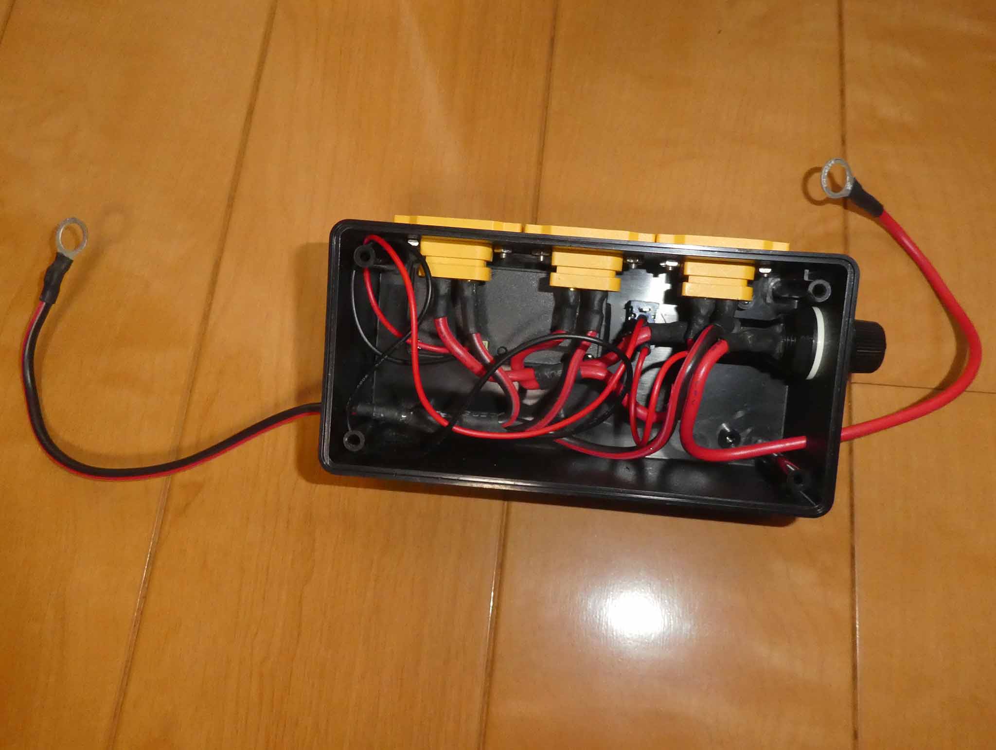 バッテリーに取り付けた状態です。 2つの子端子台とは別に、3分岐のシガーソケットもワニ口クリップでバッテリーに取り付けして使用します(このシガーソケットは鉛バッテリーでも使うので、現在はワニ口クリップ仕様にしていますが、いずれXT60コネクタを付けたシガーソケットも作る予定で、親端子台のXT60端子は1つ予備があります)。