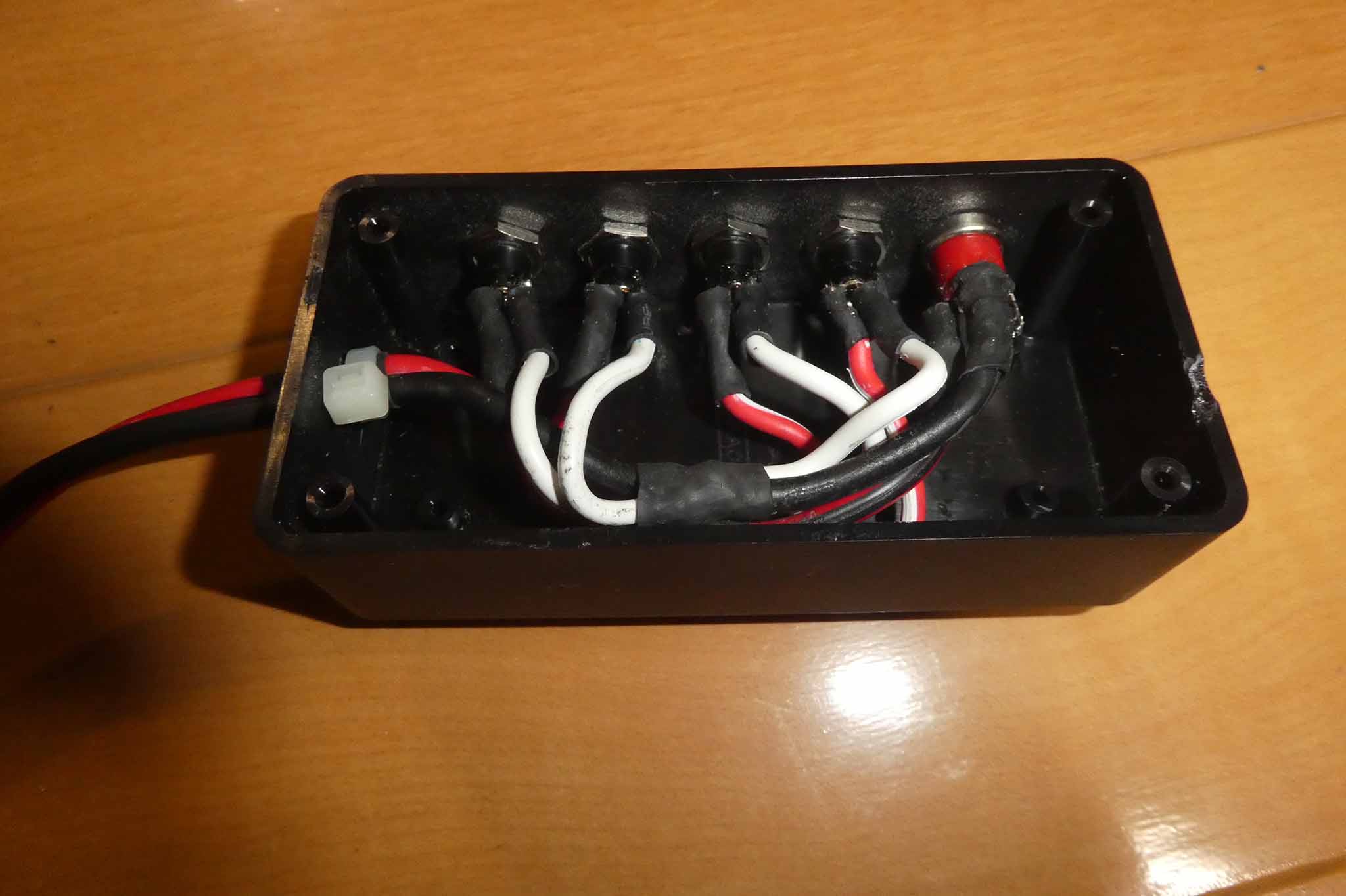 配線がおわった状態です。こちらはAWG14(2sq)のケーブルをケースに引き込んだあと、1.5sqのケーブルを5分岐しています。