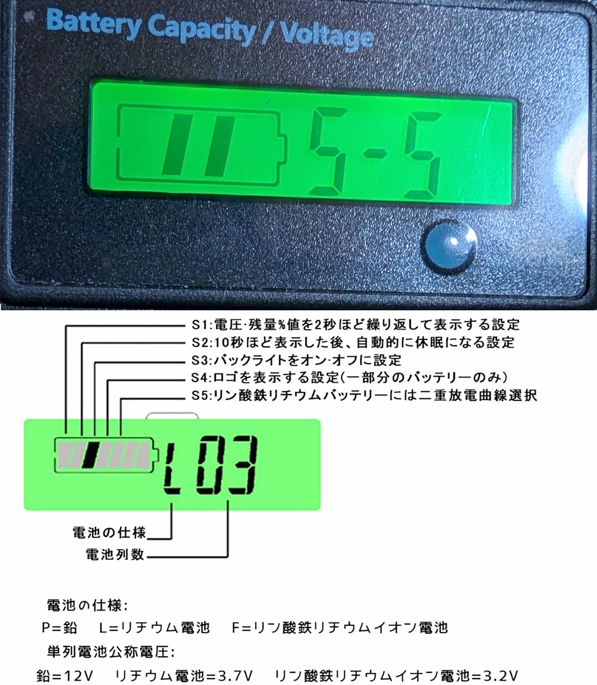 スイッチを押すと、表示が、電圧→残量%表示→表示OFF→電圧(以降繰返し)という形で変わります。