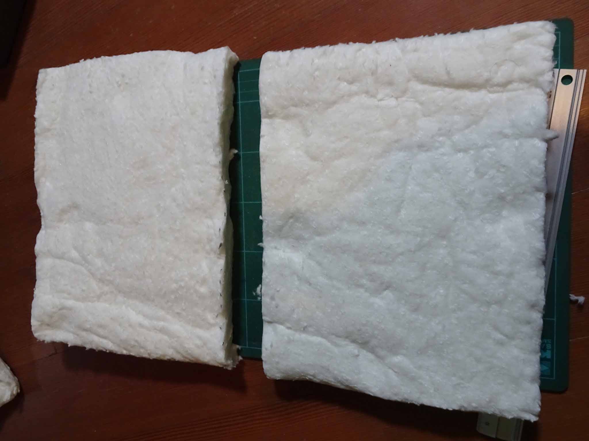 セラミック毛布にはアルミ箔を貼っているものもあるようですが、今回届いたものには全面セラミックの繊維がむき出しでした。触ってみると細かな繊維が脱落したので、このまま使うとバッグの中で繊維くずが散乱しそうなのがイヤだなと思いました。