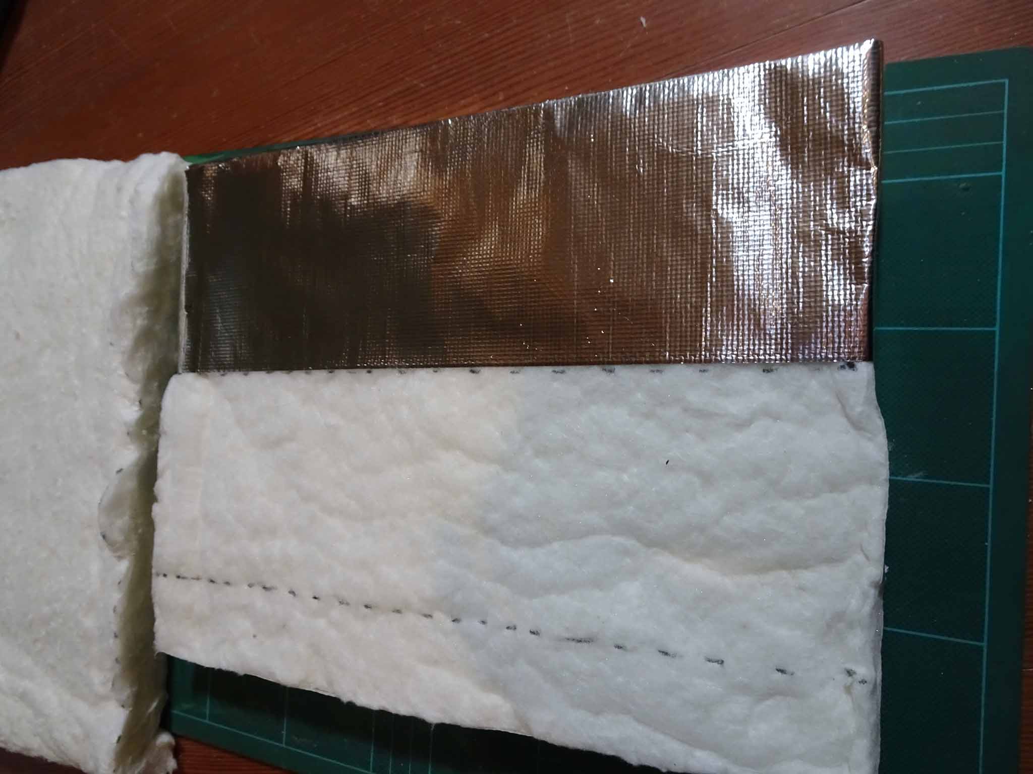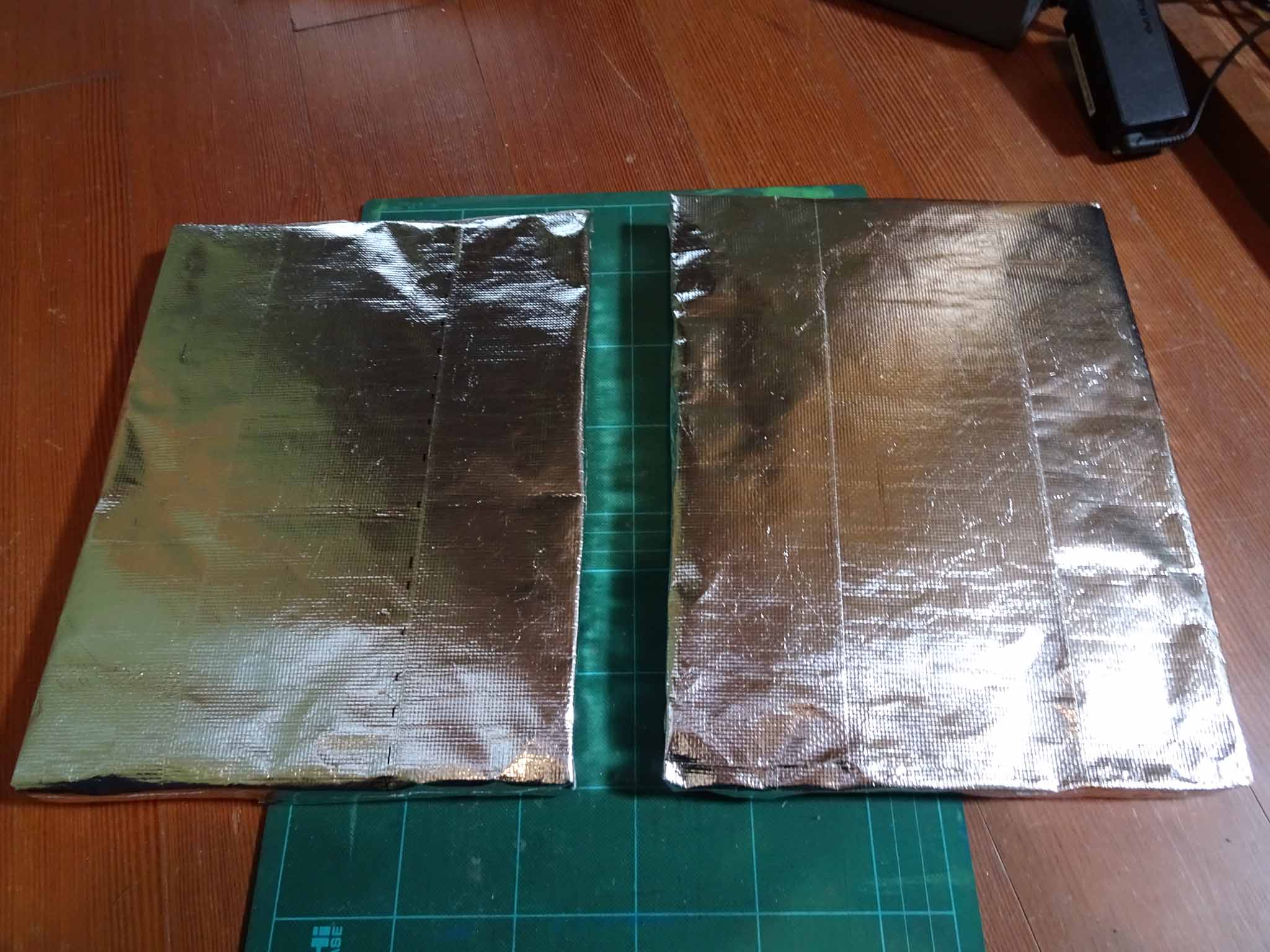 アルミテープを全6面に貼り付けて、バッテリー前後用の2つの断熱材が完成しました。