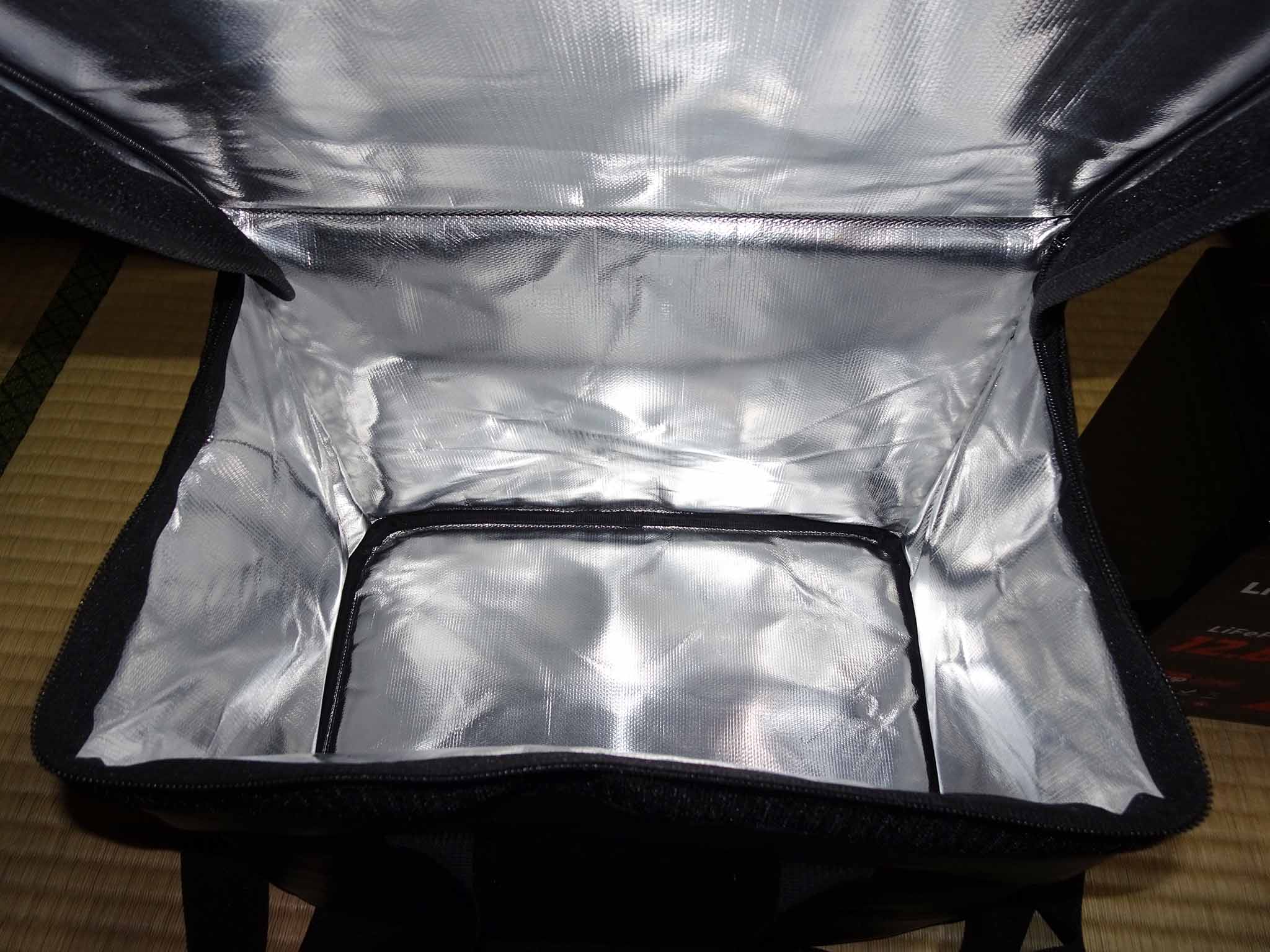 残り2つの断熱材を切断&アルミテープ貼り付けて完成し、バッグのバッテリー周囲4面に断熱材を挿入してみました。