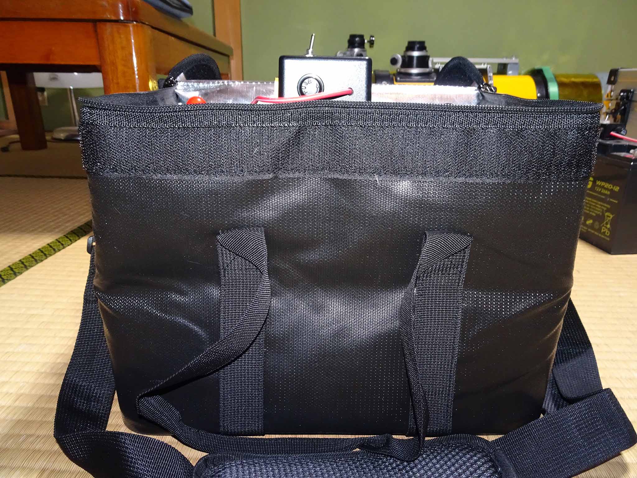バッテリーを入れて持ち上げてみましたが、底板の厚みがしっかりしていて9kgの重量のバッテリーを入れてもしっかり形を保って持ち上がりました。持ち手、ショルダーベルトの強度も問題ない感じです。