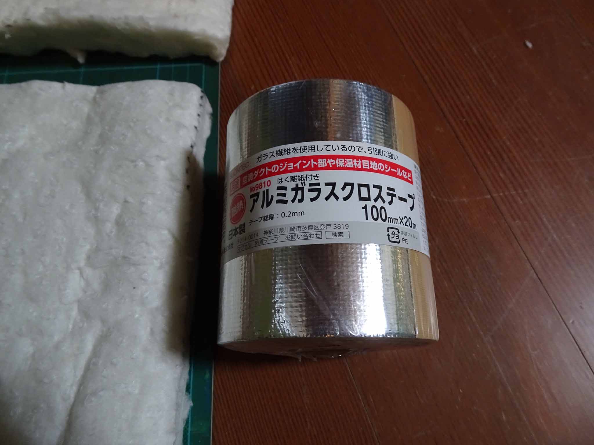 通常のアルミテープは重ね貼りができない(貼っても剥がれる)ことと、粘着力が弱いことを経験していたので、より粘着力が強いガラスクロス入りのアルミテープを準備しました。