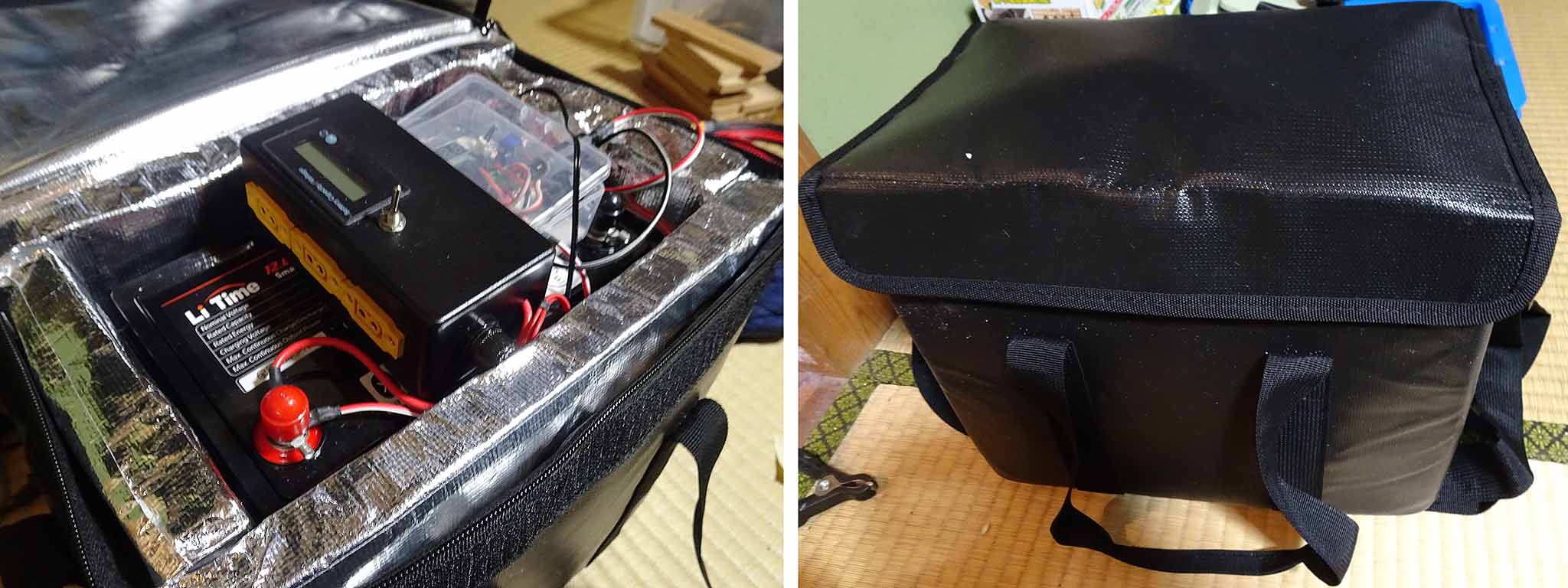 製作した電源の容量は100Ah(1,380W)でヒータシステムまで入れて約66,000円になりました。同程度の容量のポータブル電源はJackeryの電源では1,000W品で119,800円、1,500Wで149,800円ですので、約5割費用が抑えられています。
