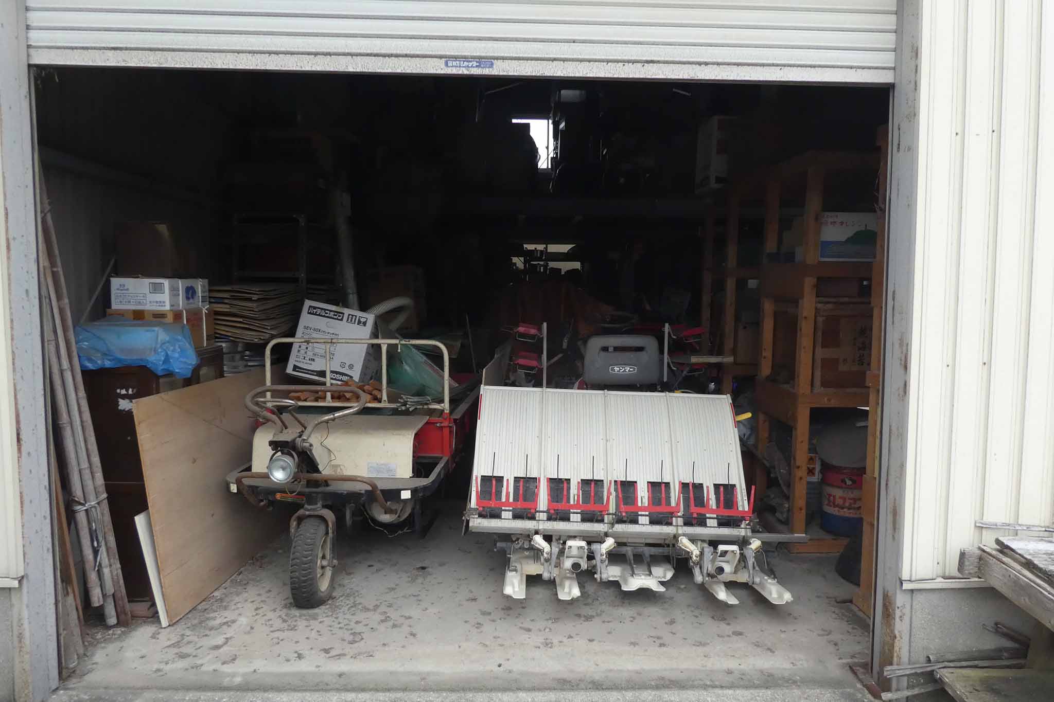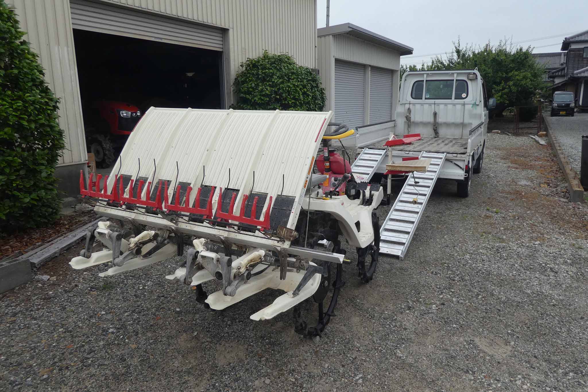田植え機を軽トラに積み込もうとしましたが、踏み板が雨でぬれていると滑って登れず、危険なので田植え機は自走で納屋まで戻りました。