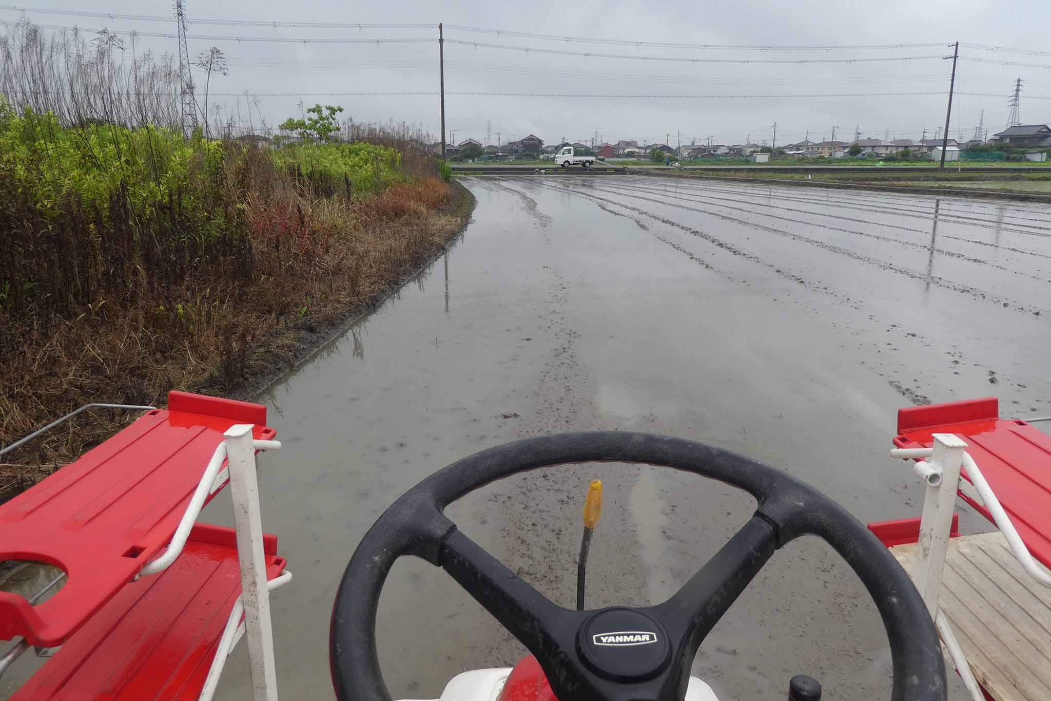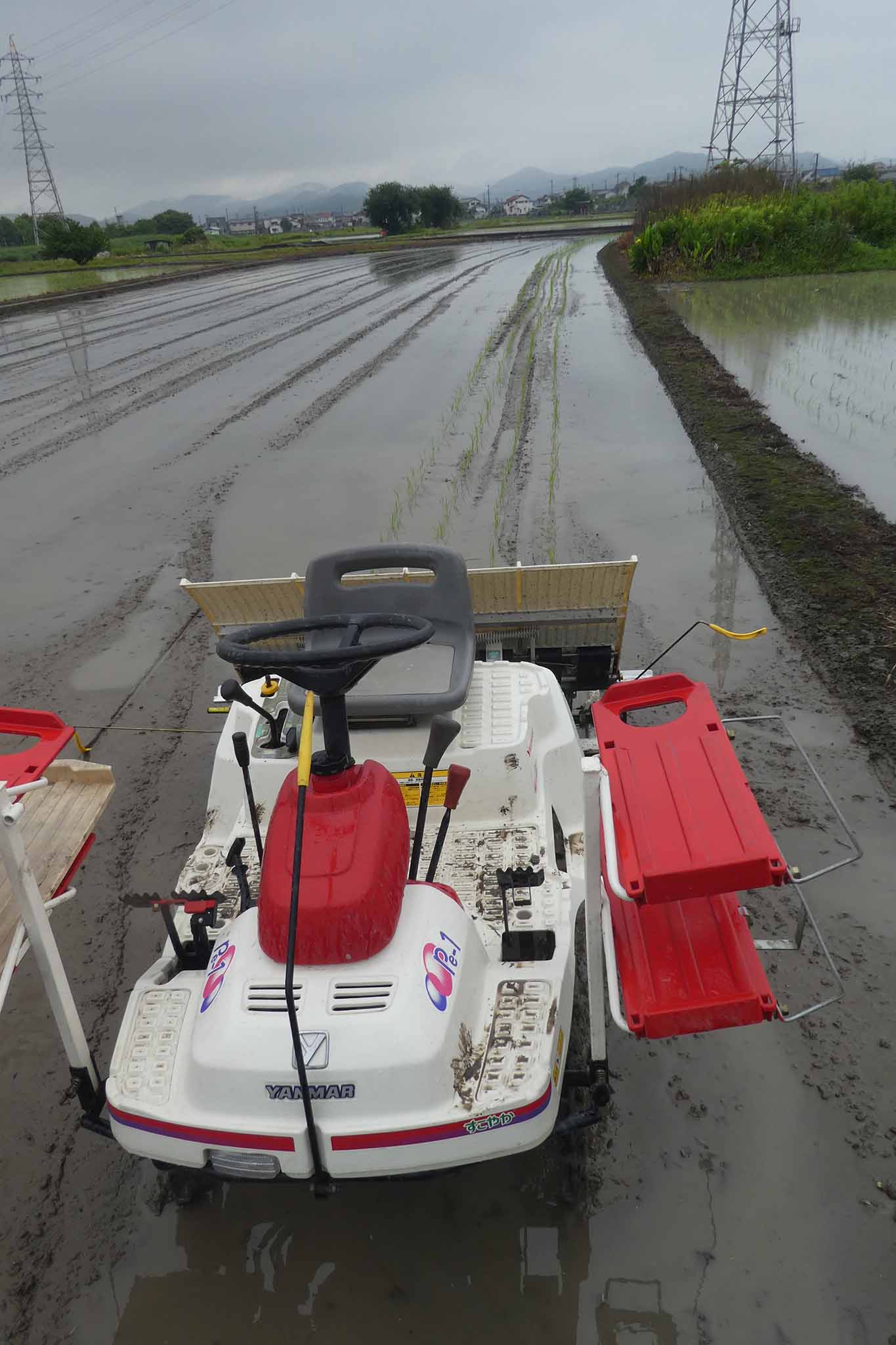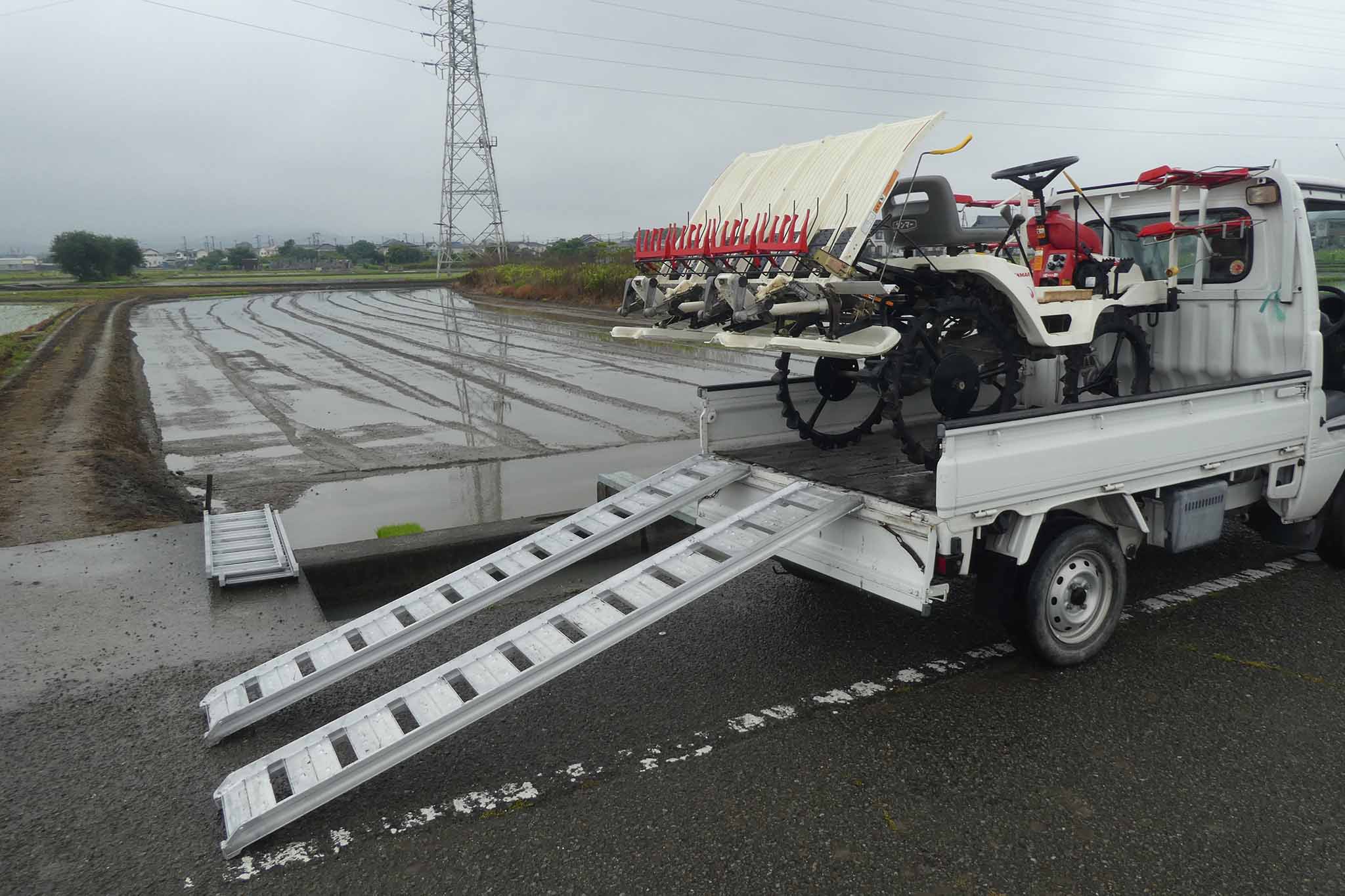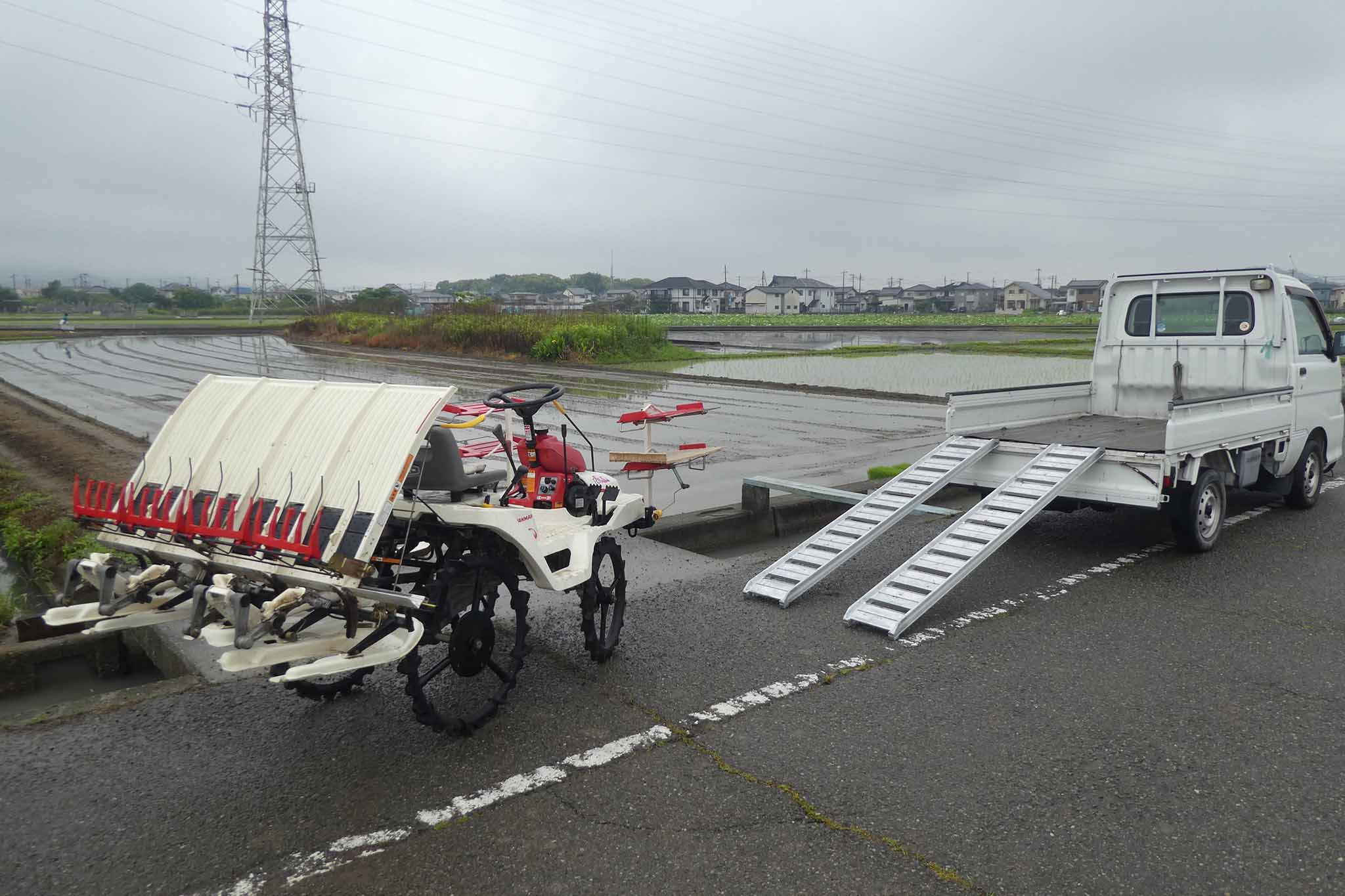 今年は雨模様の日でしたが、田植えは雨でもあまり問題になることはありません。ただ、軽トラへの田植え機の積み込みはアルミブリッジが濡れると難しい(危ない)ことを知りました。