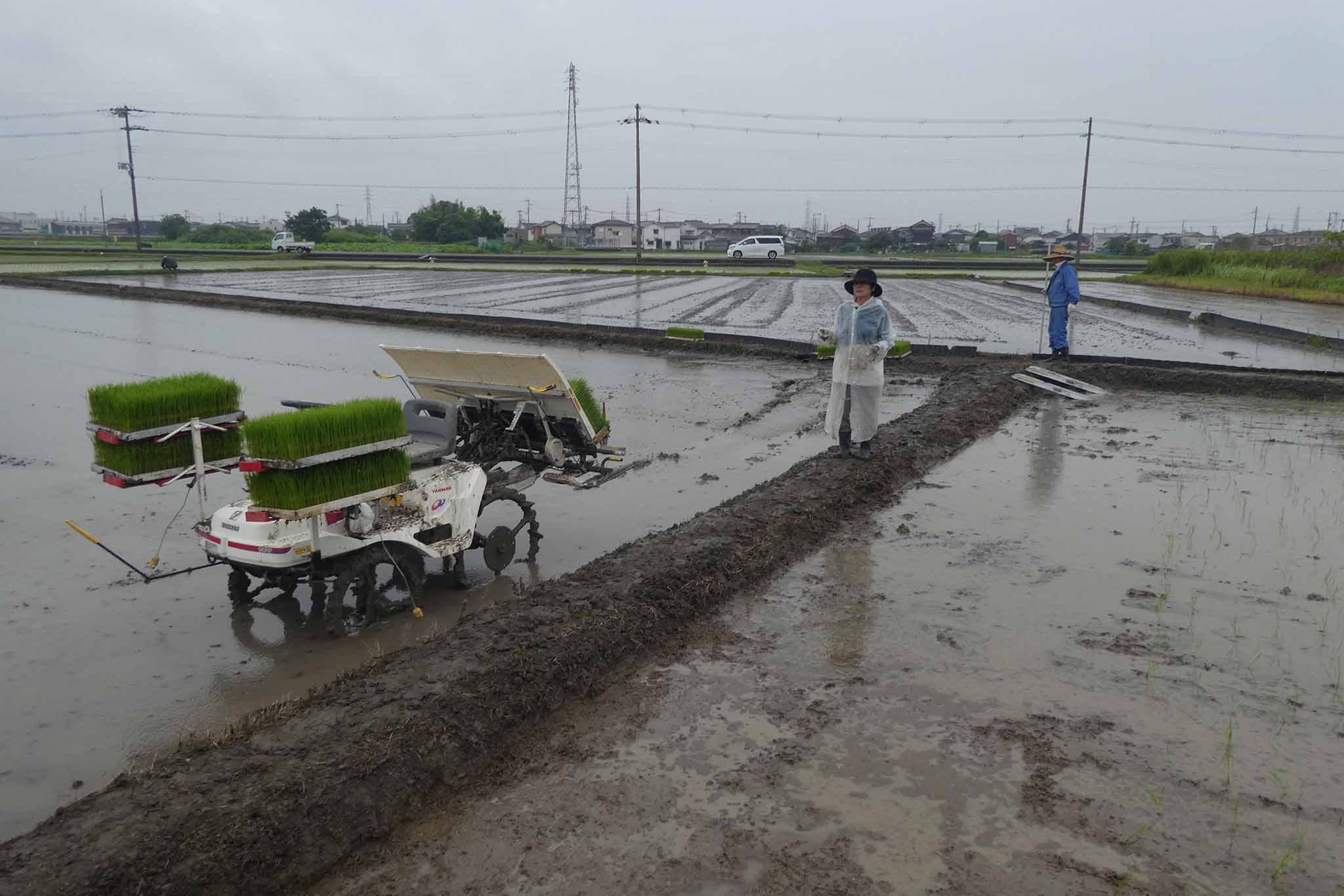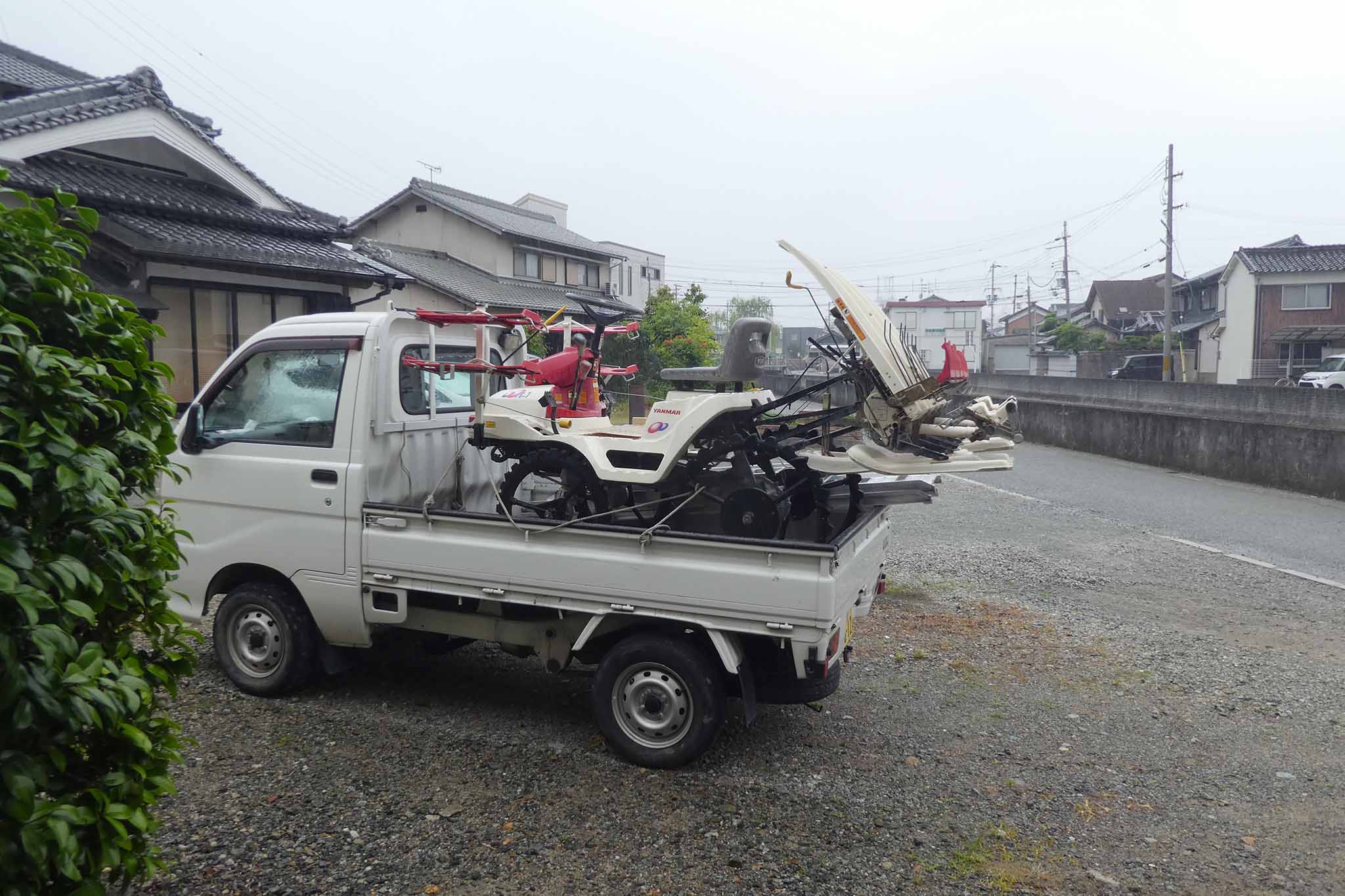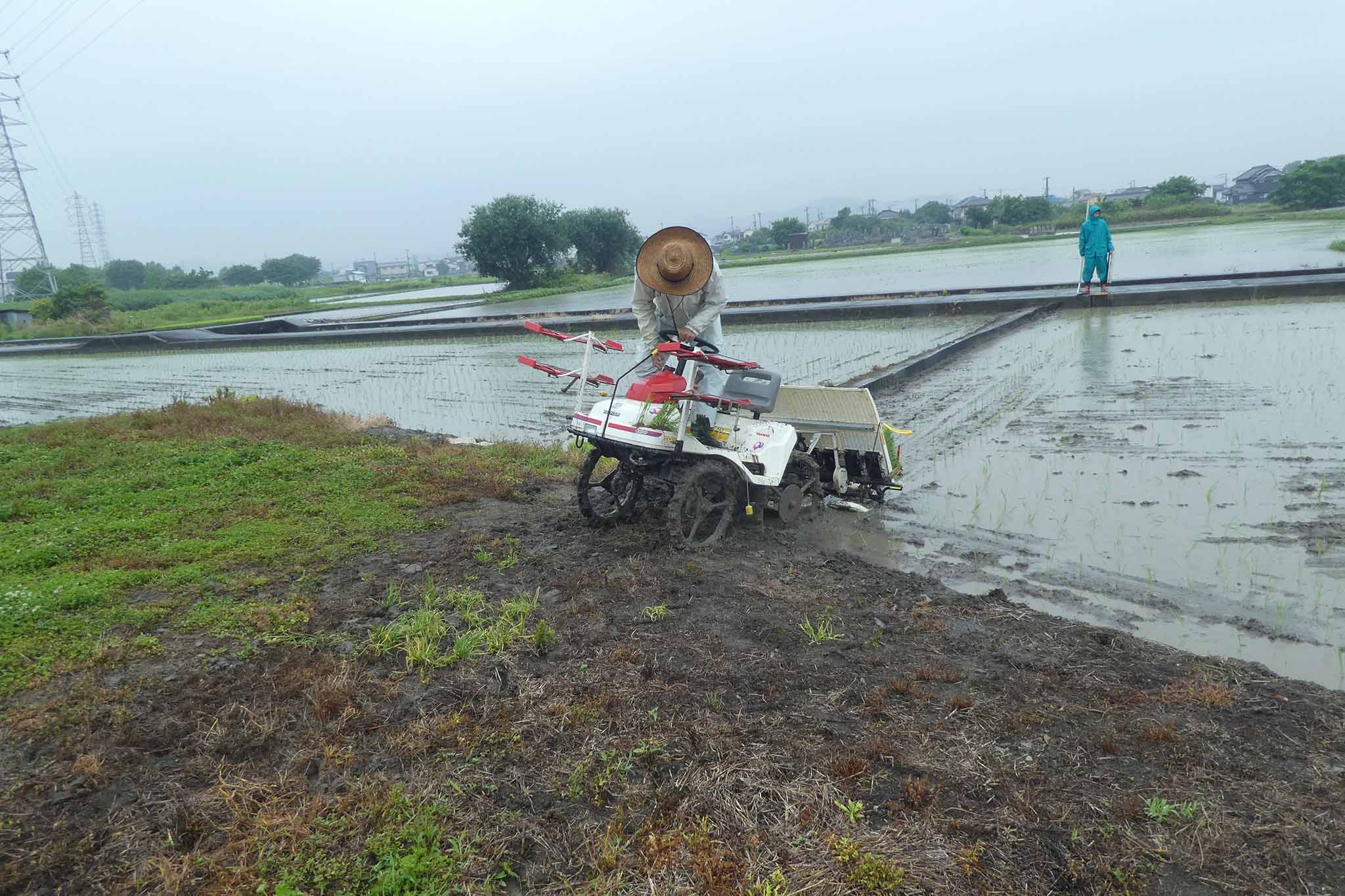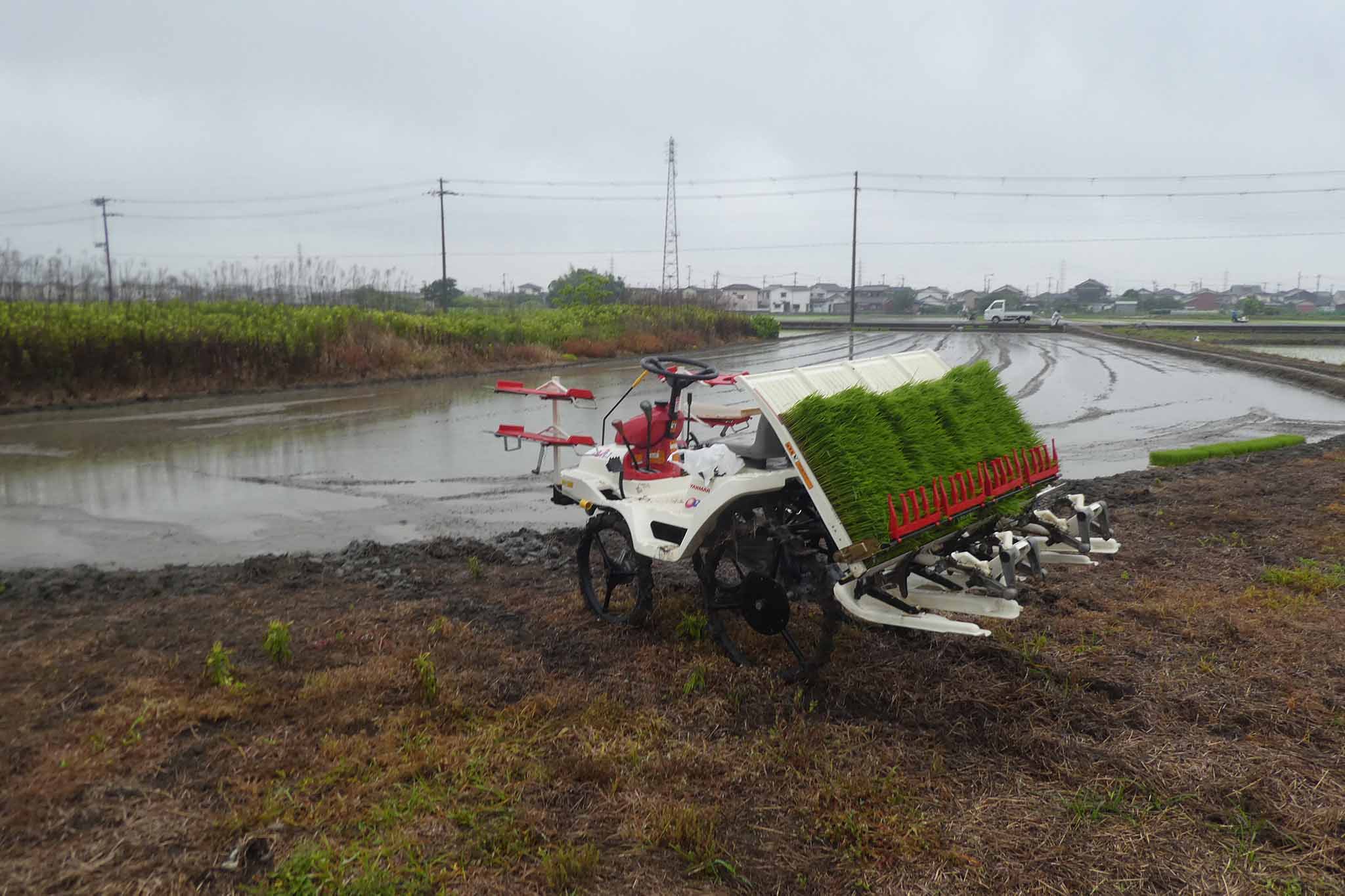 今年は雨模様の日でしたが、田植えは雨でもあまり問題になることはありません。ただ、軽トラへの田植え機の積み込みはアルミブリッジが濡れると難しい(危ない)ことを知りました。