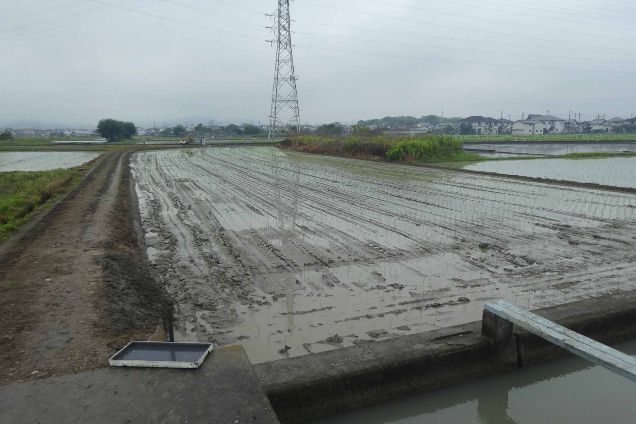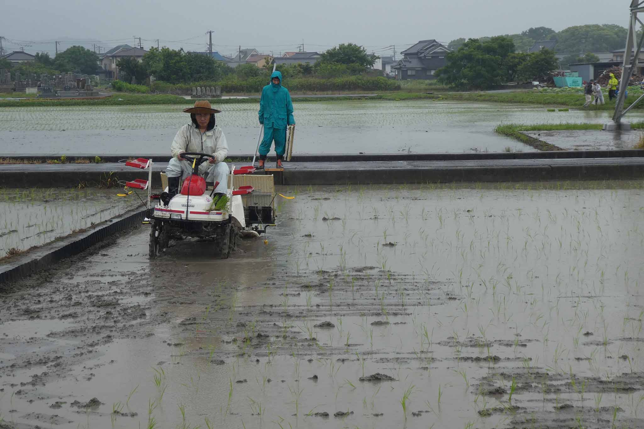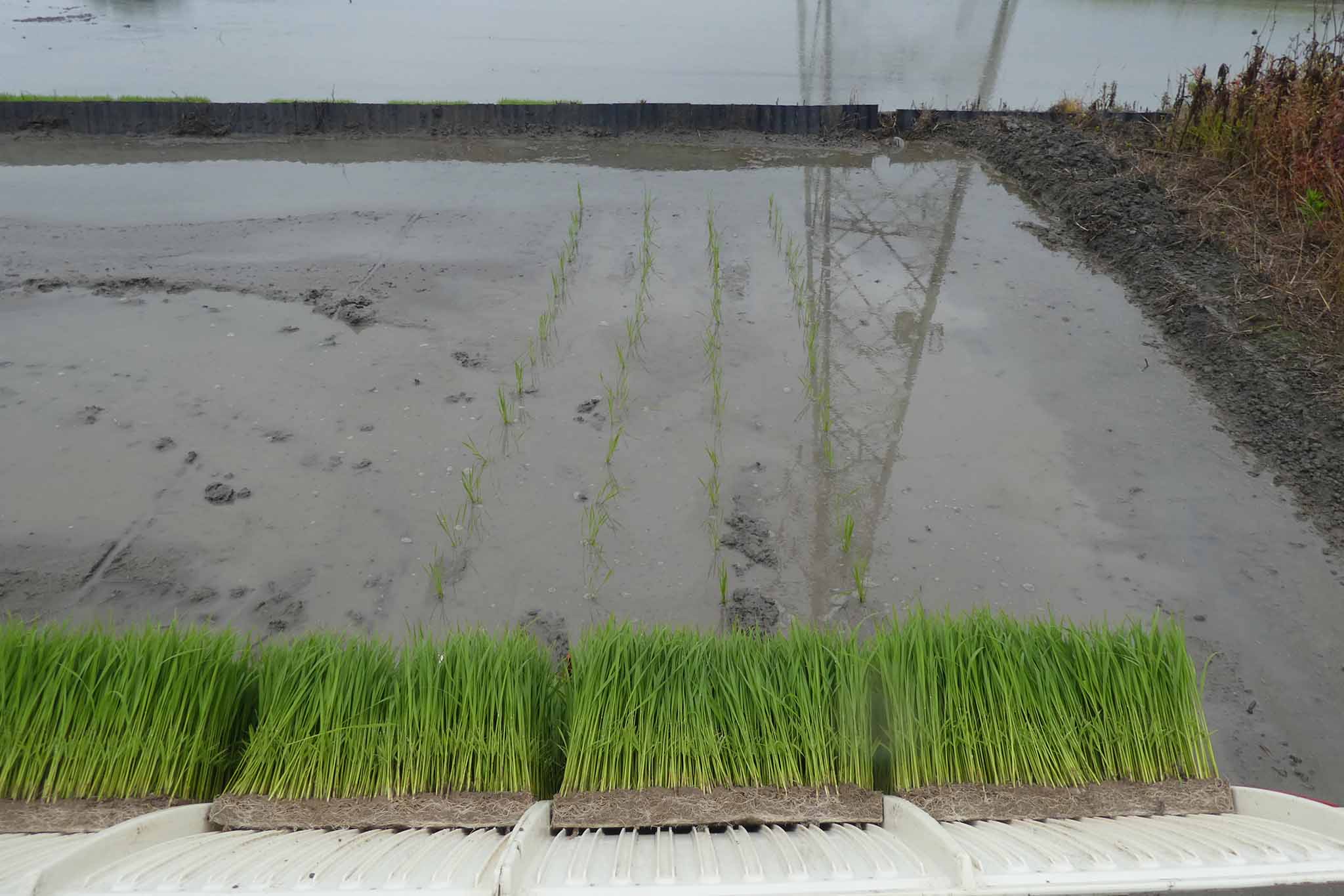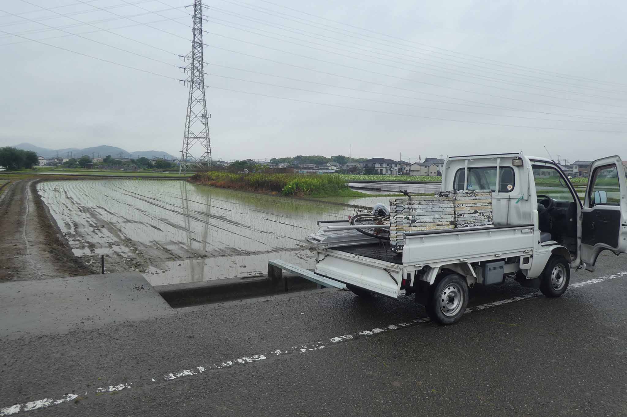 今年は雨模様の日でしたが、田植えは雨でもあまり問題になることはありません。ただ、軽トラへの田植え機の積み込みはアルミブリッジが濡れると難しい(危ない)ことを知りました。