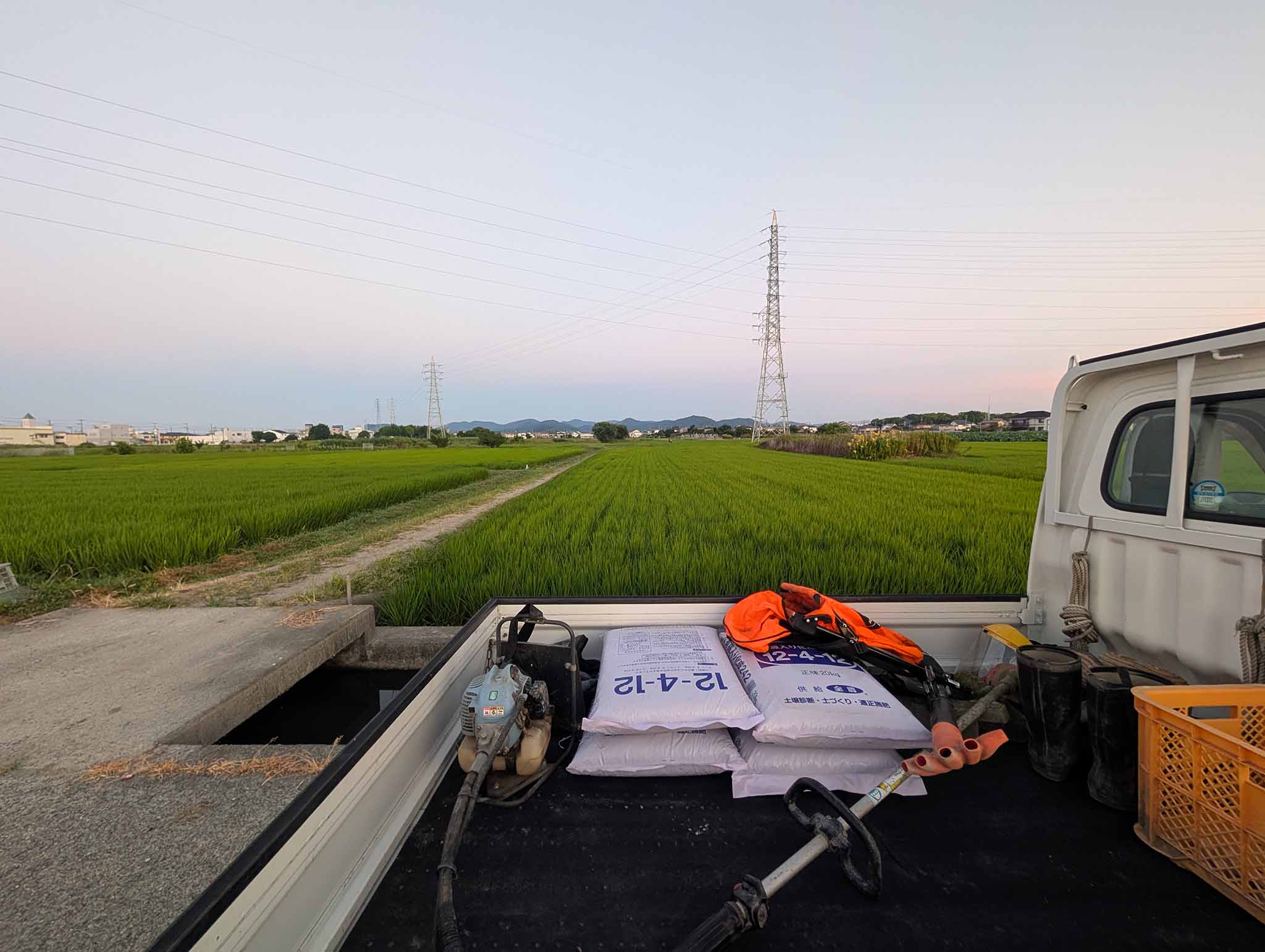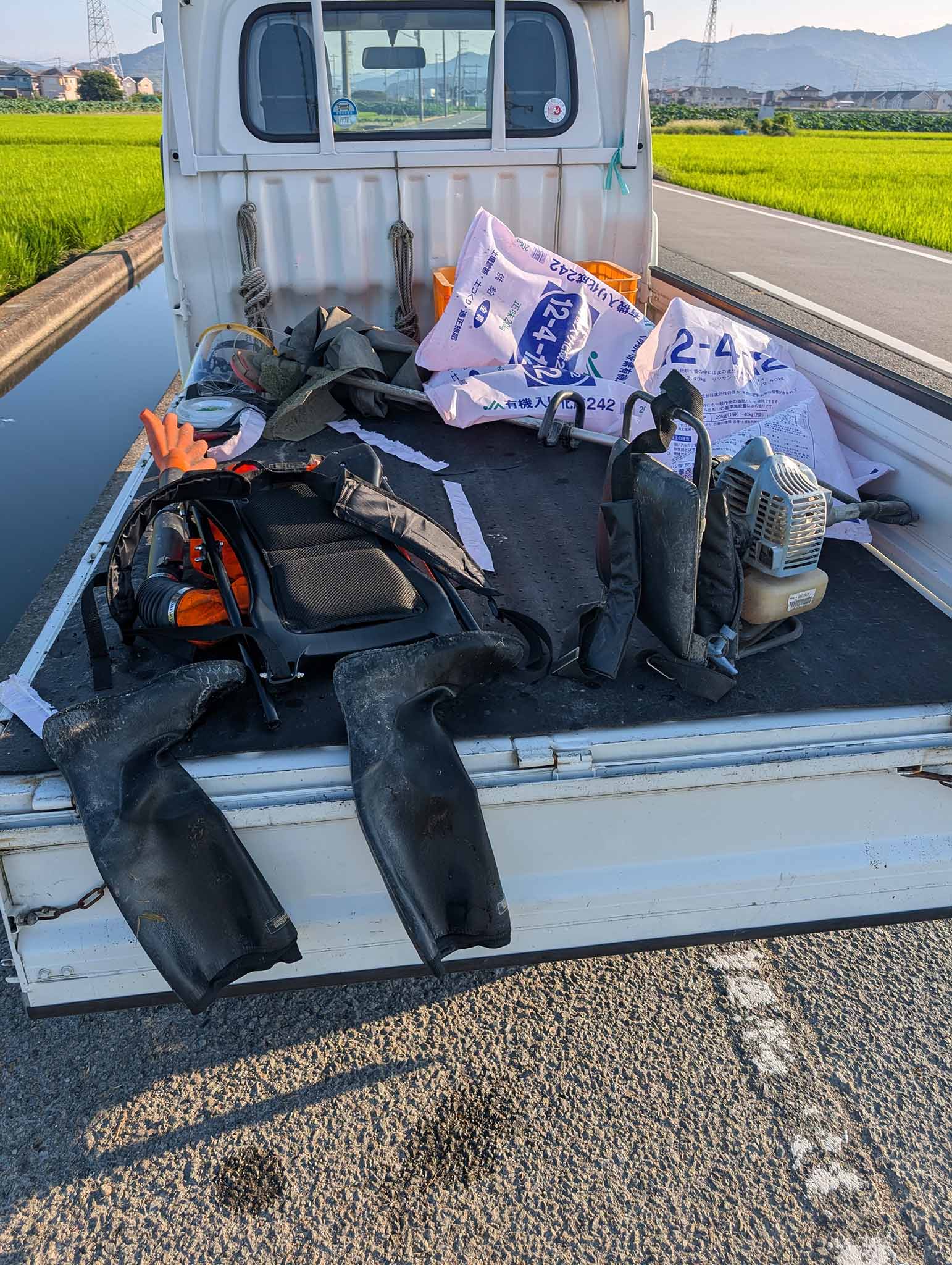 散布する穂肥と刈払い機を軽トラに積んで、田んぼに到着。