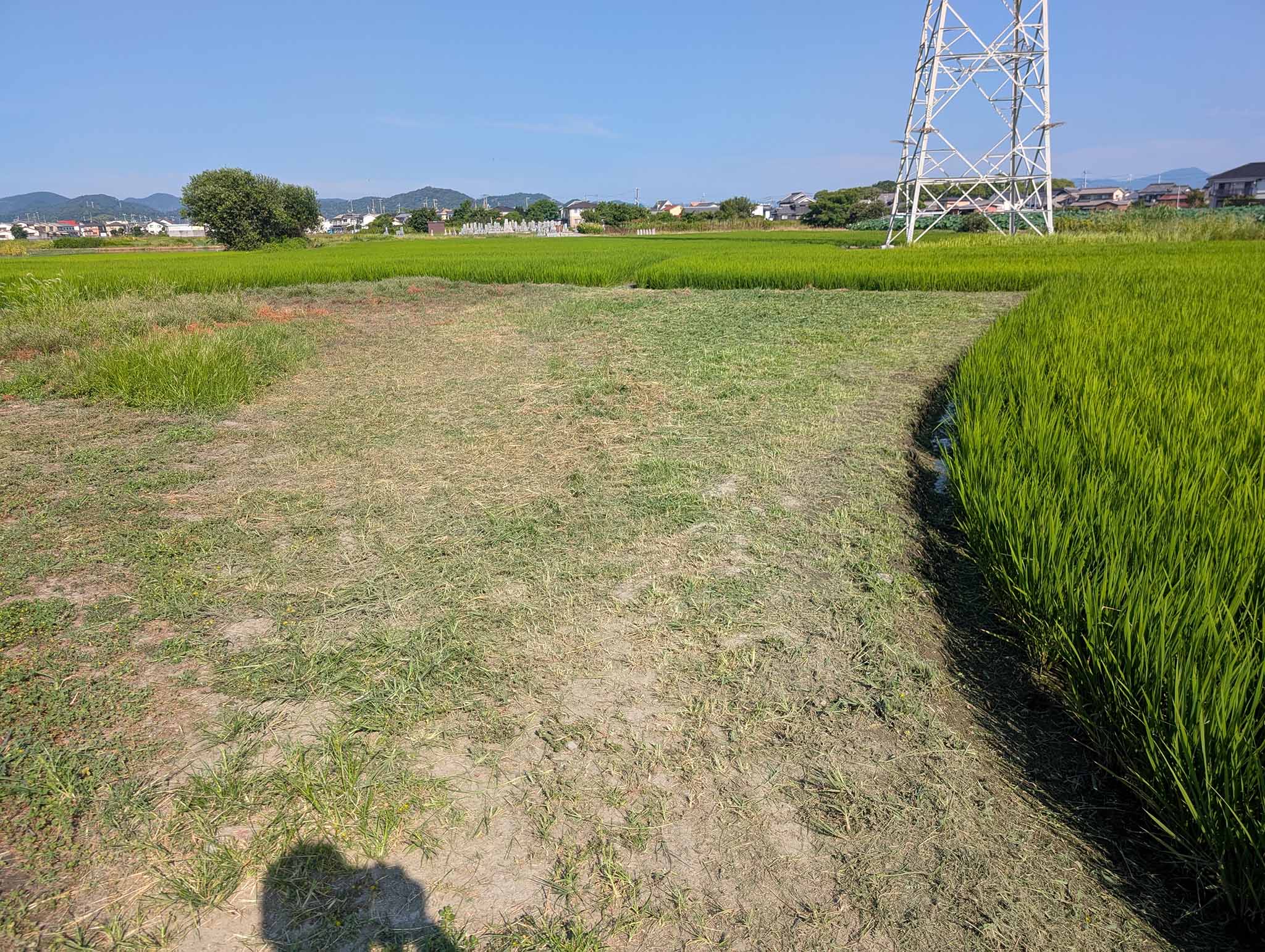 これ(畔の右側)が1週間の雑草の育成具合です。