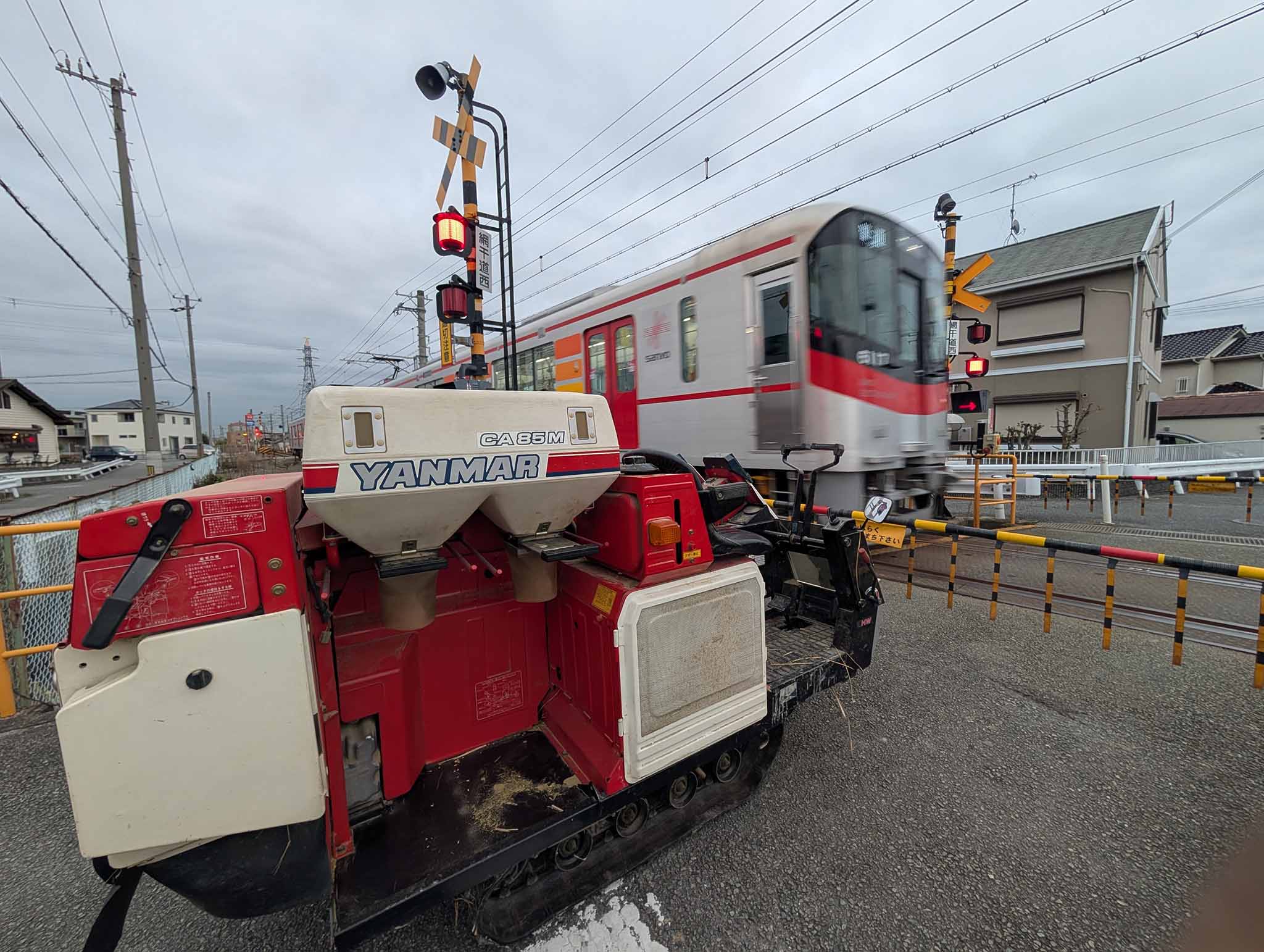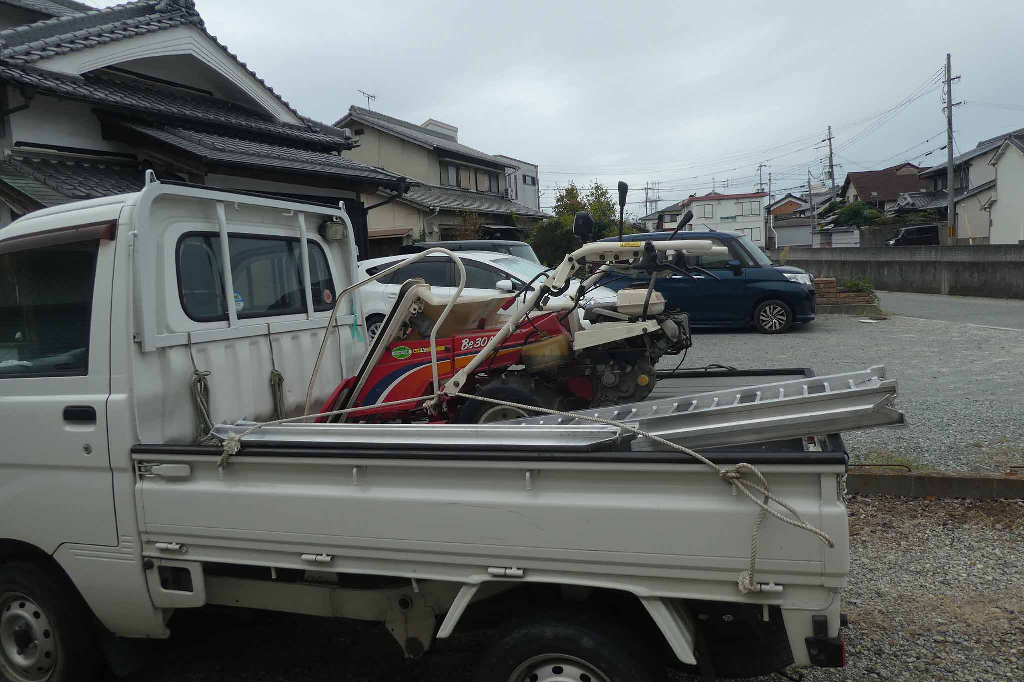 遅れて、コンバインは自走で田んぼへ到着しました。