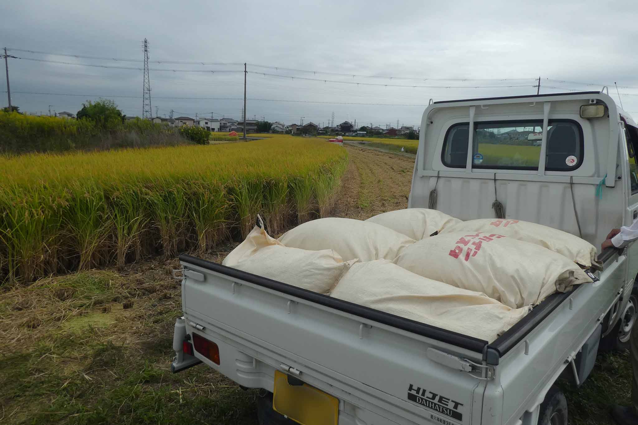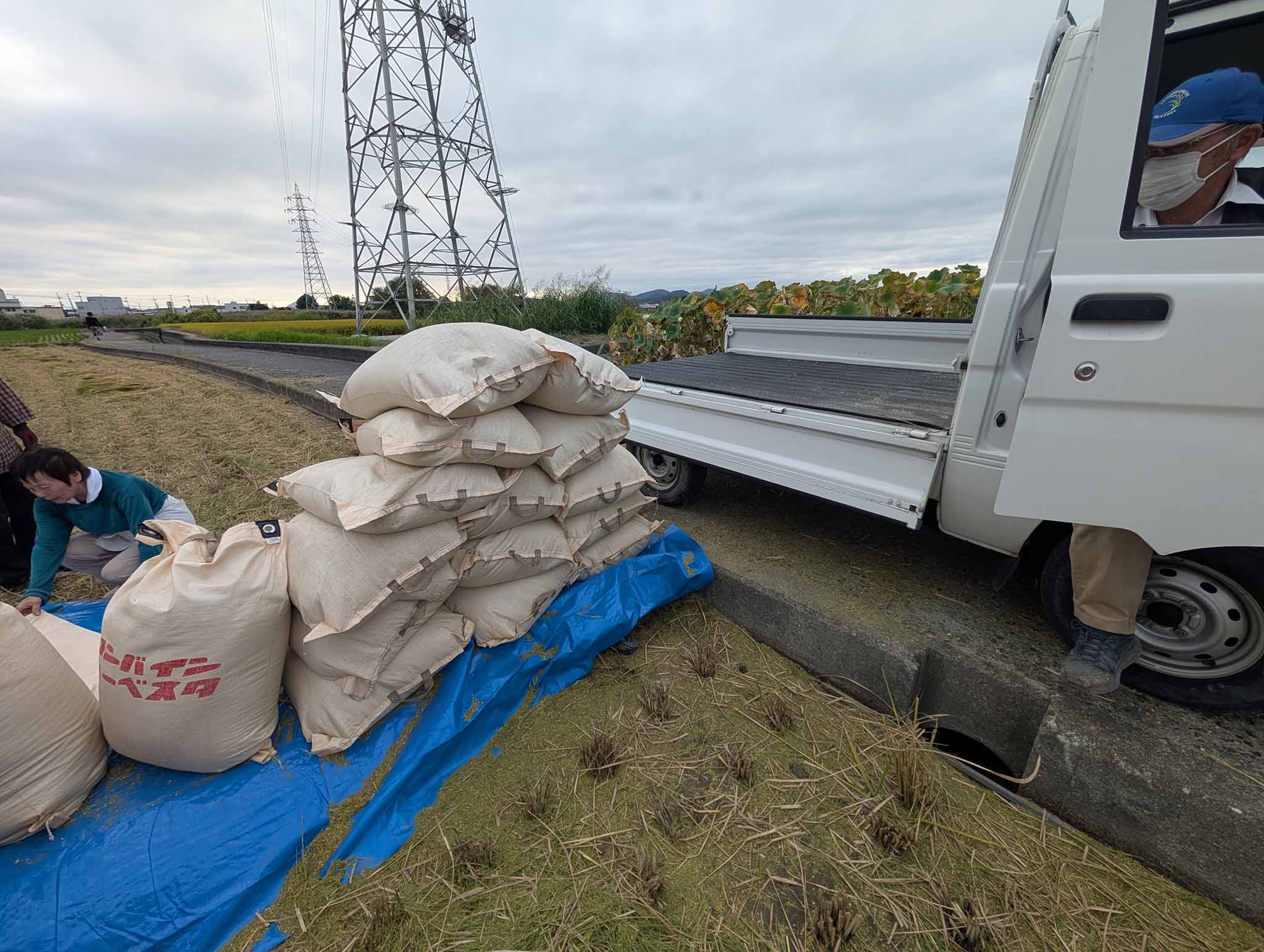 この田んぼは隣接する道が軽トラ1台分の幅しかないので、一旦、籾袋をブルーシートの上に積んでからまとめてトラックに載せます。