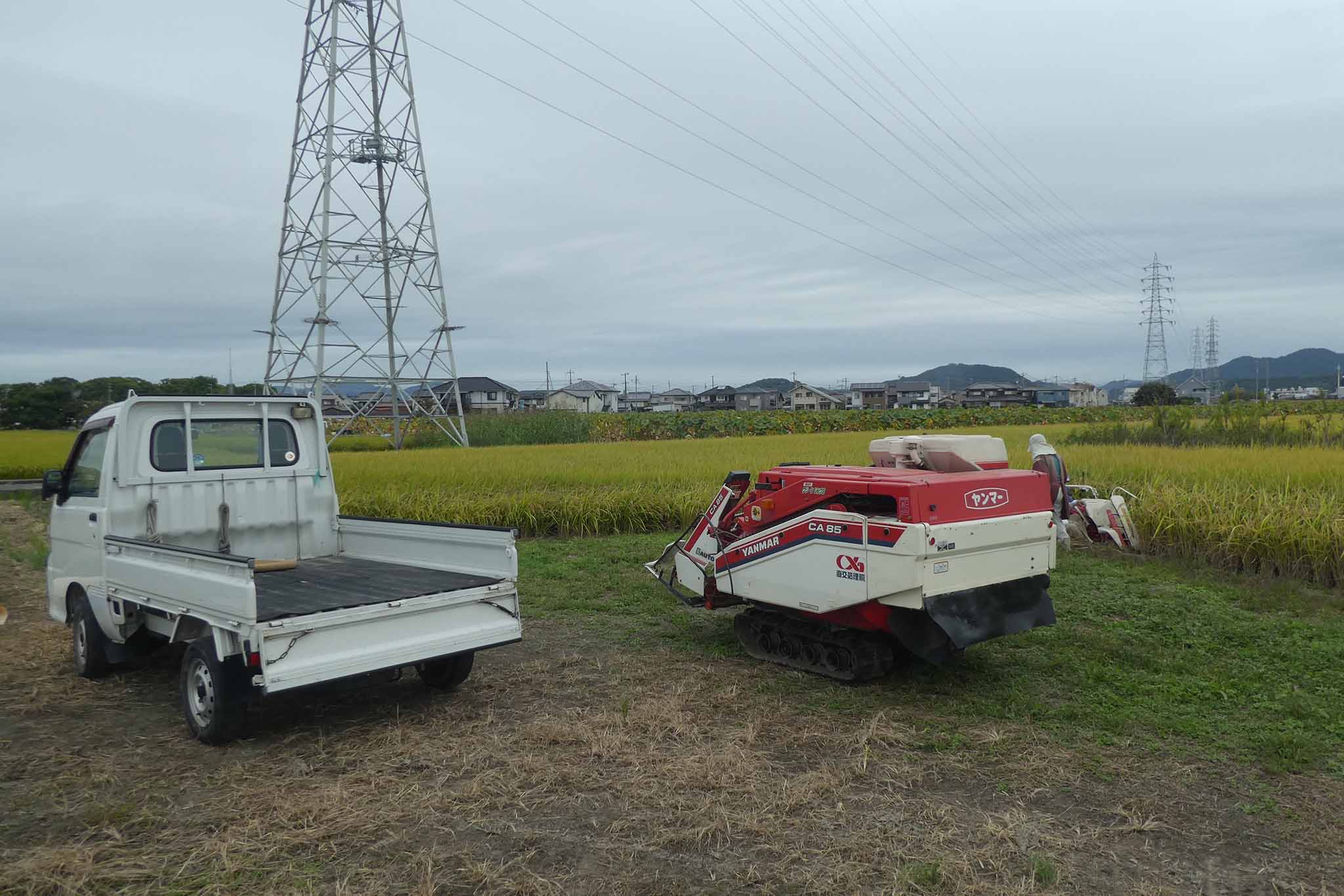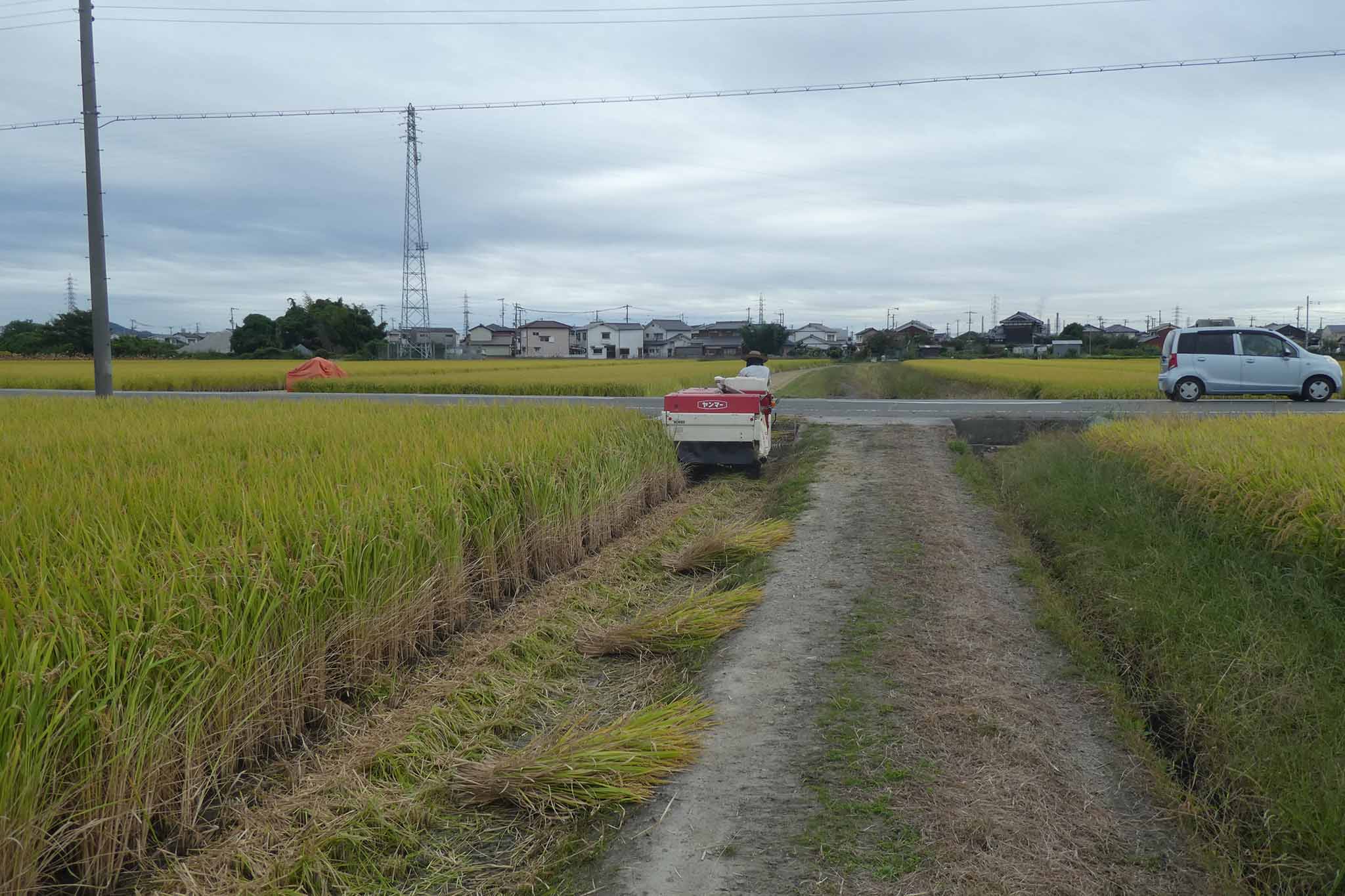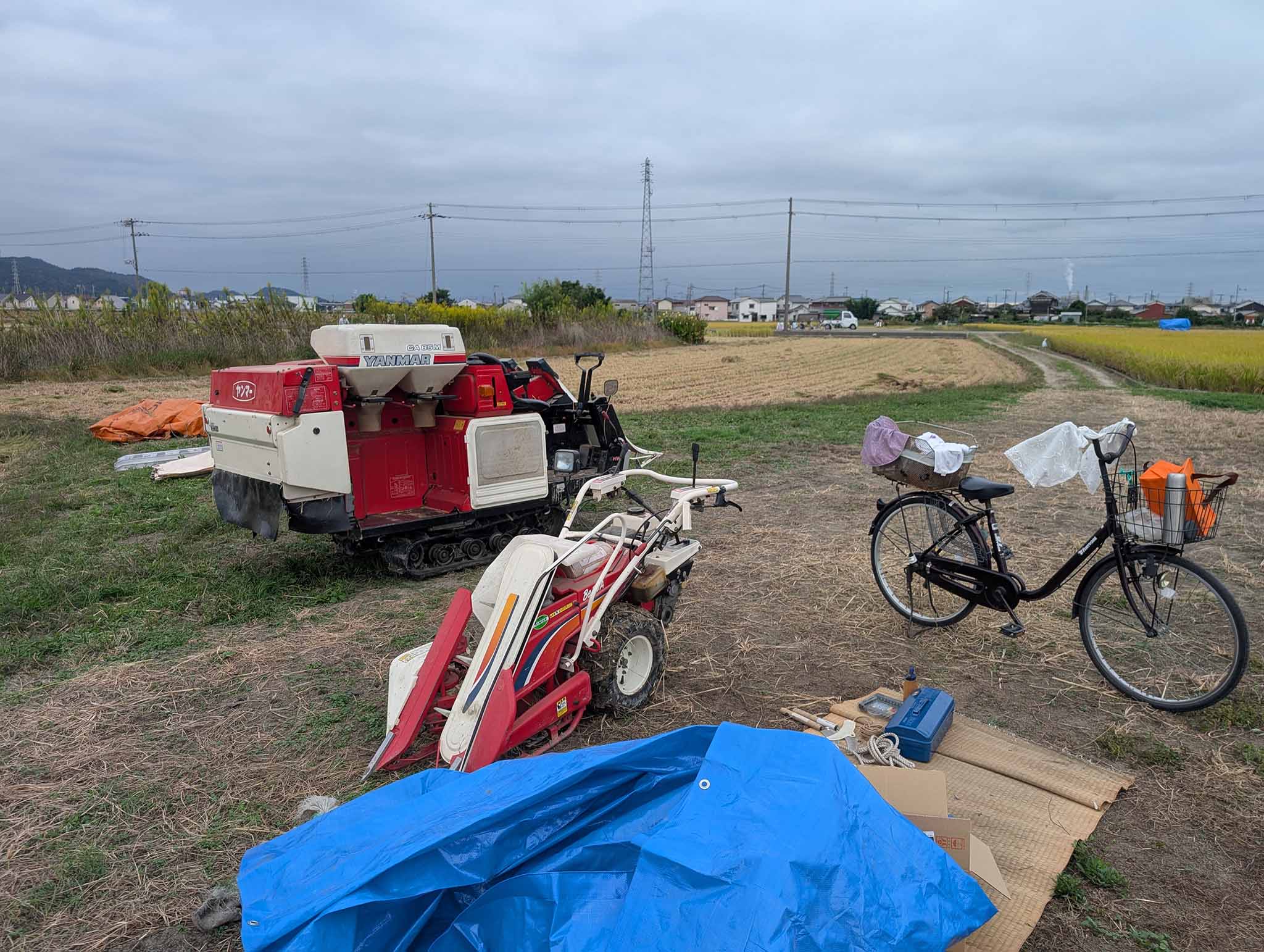 さて、コンバインを田んぼへ入れます。この時点で9時半過ぎでした。